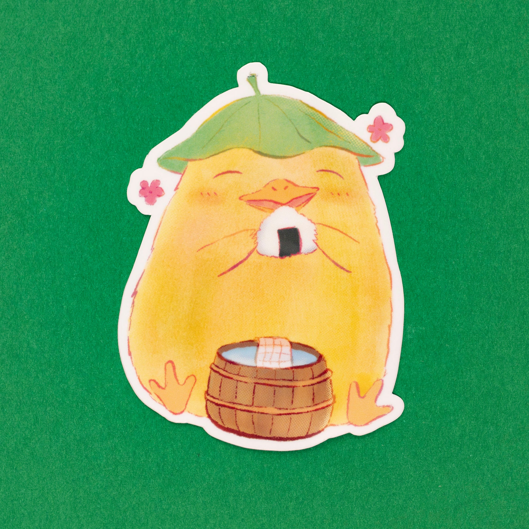 A happy duck spirit eating a delicous rice ball after taking a warm bath.