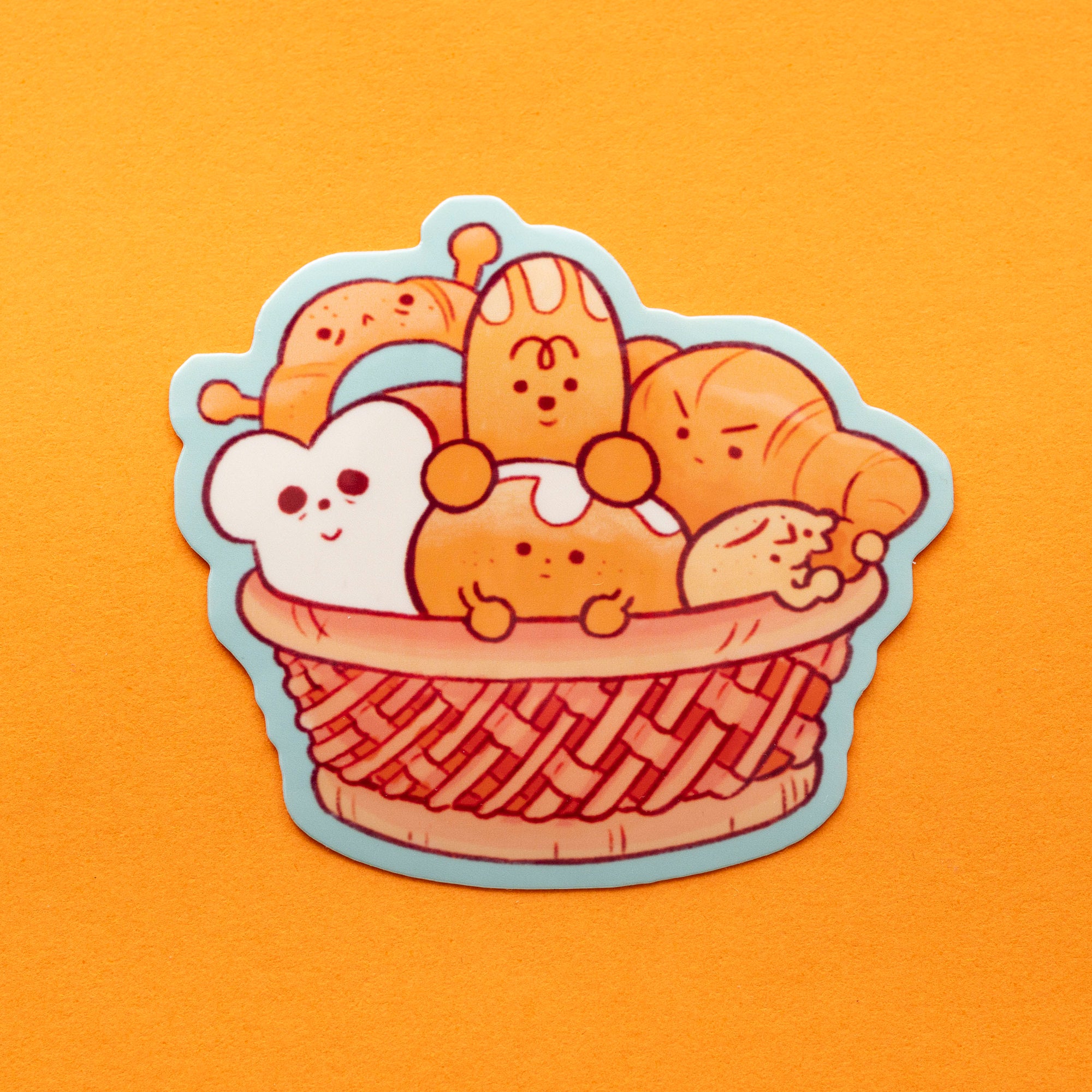 This sticker features an assortment of lil guys as seen in Bimfy's student film 'Le Pain' ! Includes Mama Loaf, Big Sourdough, Lil Sourdough, Simit, Croissant and Baby Bagel.