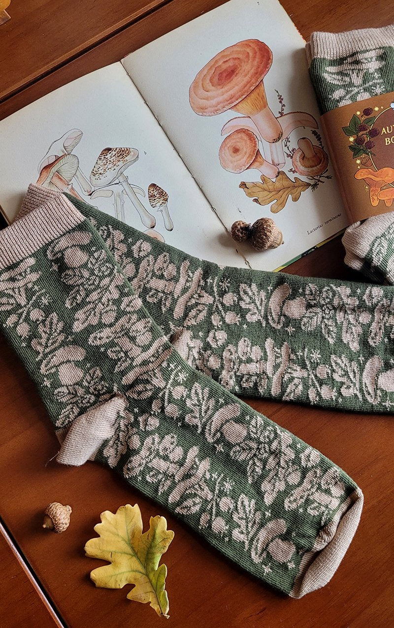 Autumn bounty socks celebrate the bounty of autumn. From fungi, to nuts and berries, these socks are designed to revel in the wonders of the crisp harvest season. Wear them on your autumnal adventures and let them accompany you as you stomp through crispy leaves!