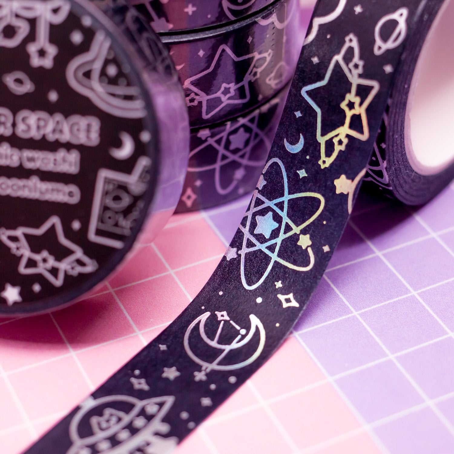 Cute space and cat themed washi tape with a silver holographic effect! Perfect for decorating notebooks and journals!