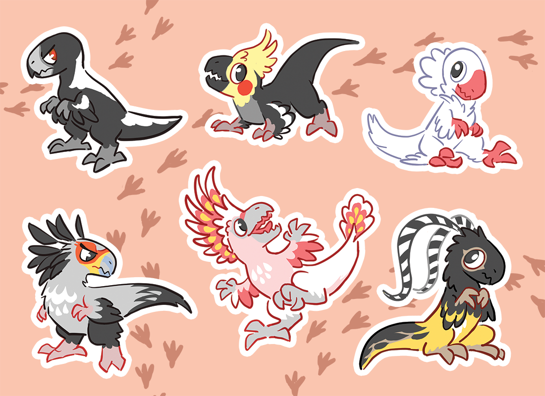 Haven't we all wondered what colour dinosaurs really were? Well allow me to submit to you these tiny microraptors with modern bird colourations! Kiss cut so you can easily peel off each one and with transparent borders so no annoying white border when you stick 'em! Sticker sheet measures approx 4x6 inches while the individual stickers are about 1.5x1.5 inches. Small and cute!This sturdy weatherproof gloss vinyl will hold up to years of outdoor use and heavy handling! Great for phones, handheld consoles, vehicles, etc.