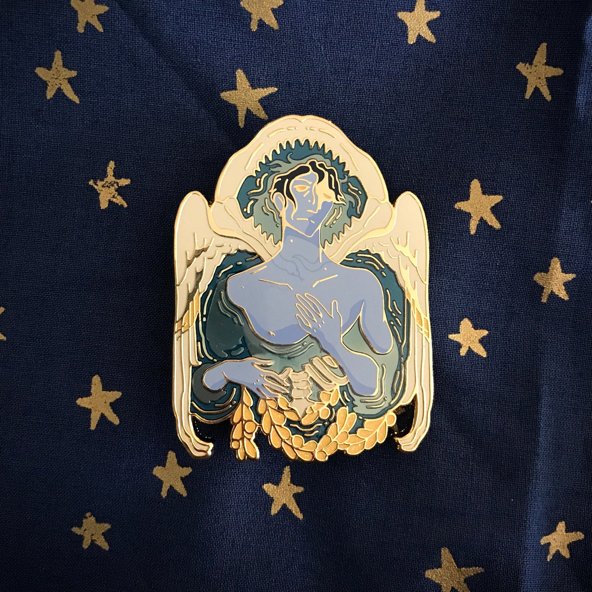 This pin has gold plating, hard enamel, half-raised metal under transparent enamel, gold glitter accents, and is 2.3 inches (5.8 cm) long. It has two pin posts and rubber backings.This listing is for seconds grade pins. For my complete pin grading policy, please see my About & FAQ: linktr.ee/ultra.infinite