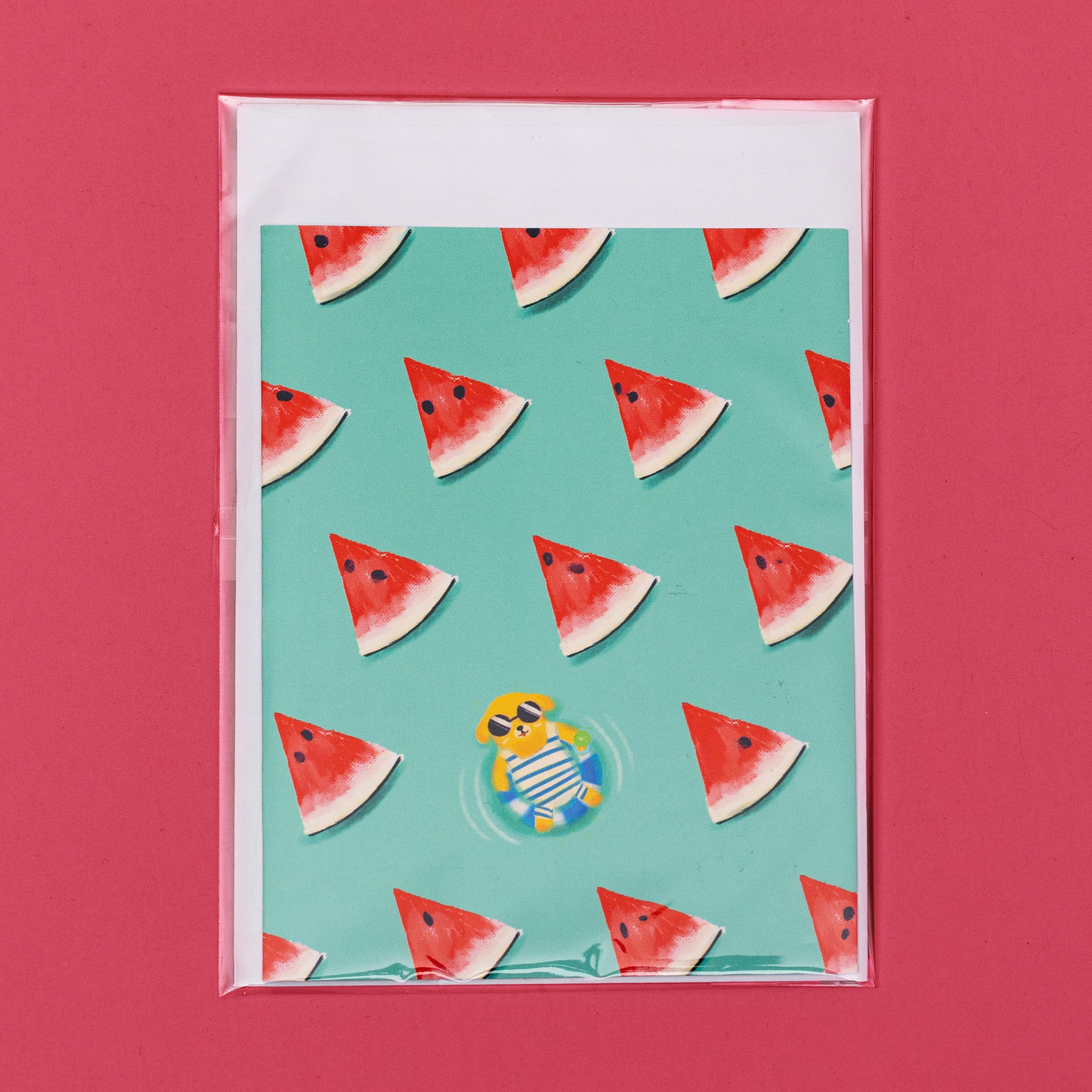 A cute greeting card featuring a relaxed dog basking in a pool doughnut, with watermelon slices around it. Perfect for any celebration for any dog, watermelon, and summer lover! Each card comes with one self-sealing white envelope. Inside text reads: "You're one in a melon!"