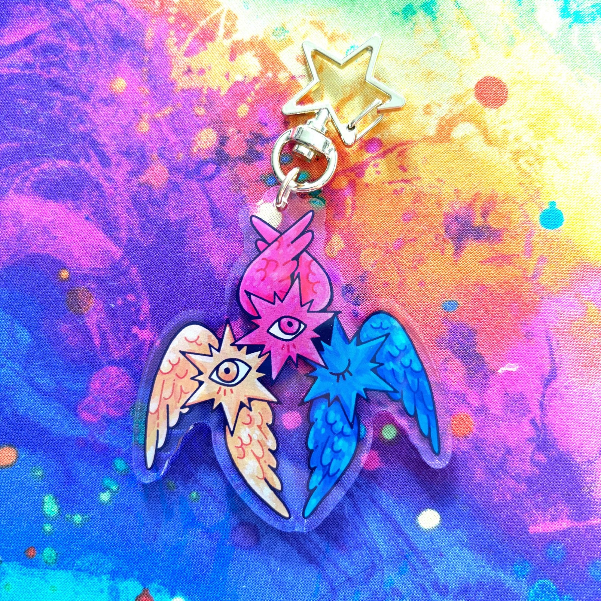 | This acrylic keychain is 2.5 inches (6.3 cm) on the longest side, double-sided with the same print on both sides; it has a gold star clasp. |