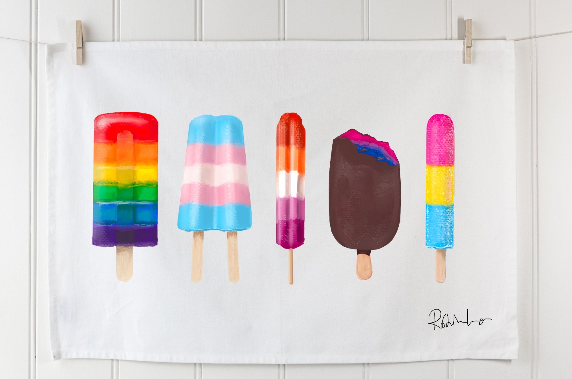The Tea towel features the stylised Pride flags of the Gay, Trans, Lesbian, Bi and Pan communities (order from left to right).