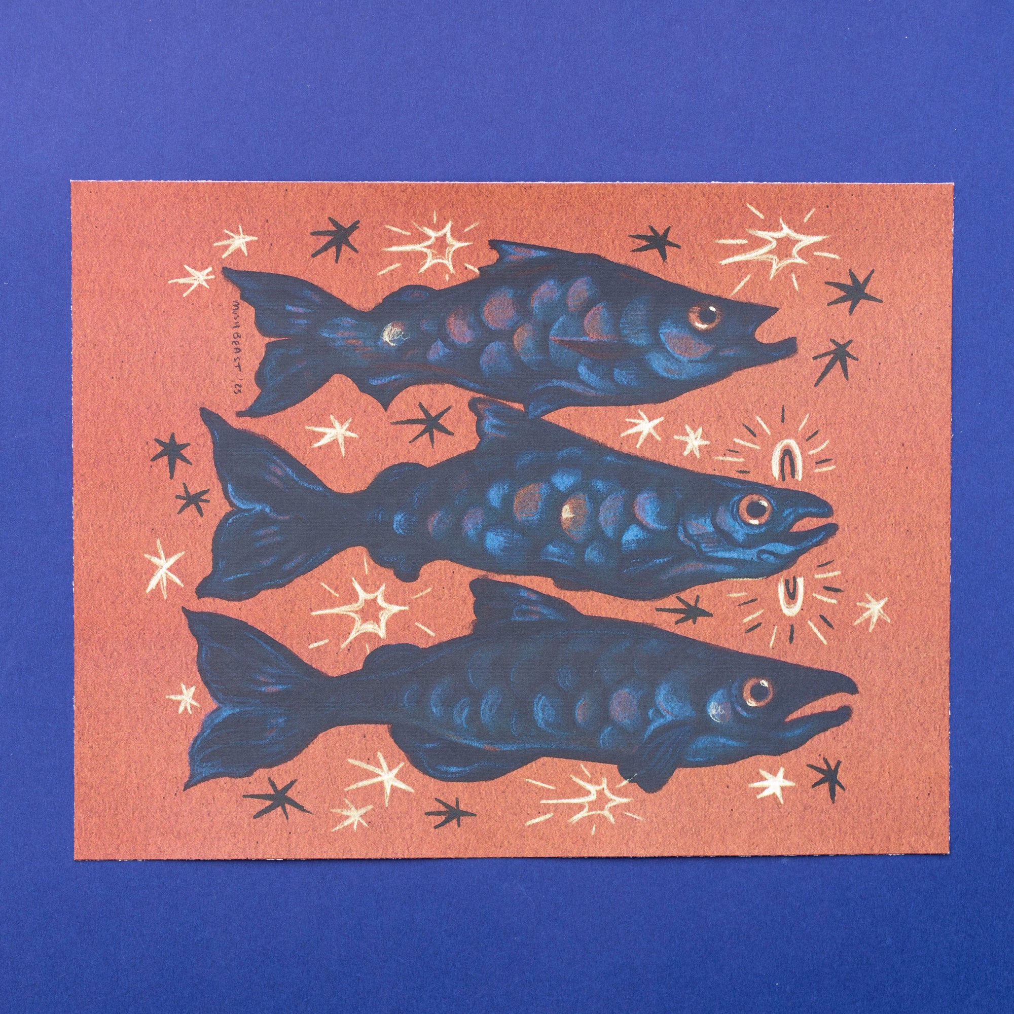 three salmon representing pisces from the zodiac with a complimentary colour palette of orange & blue.