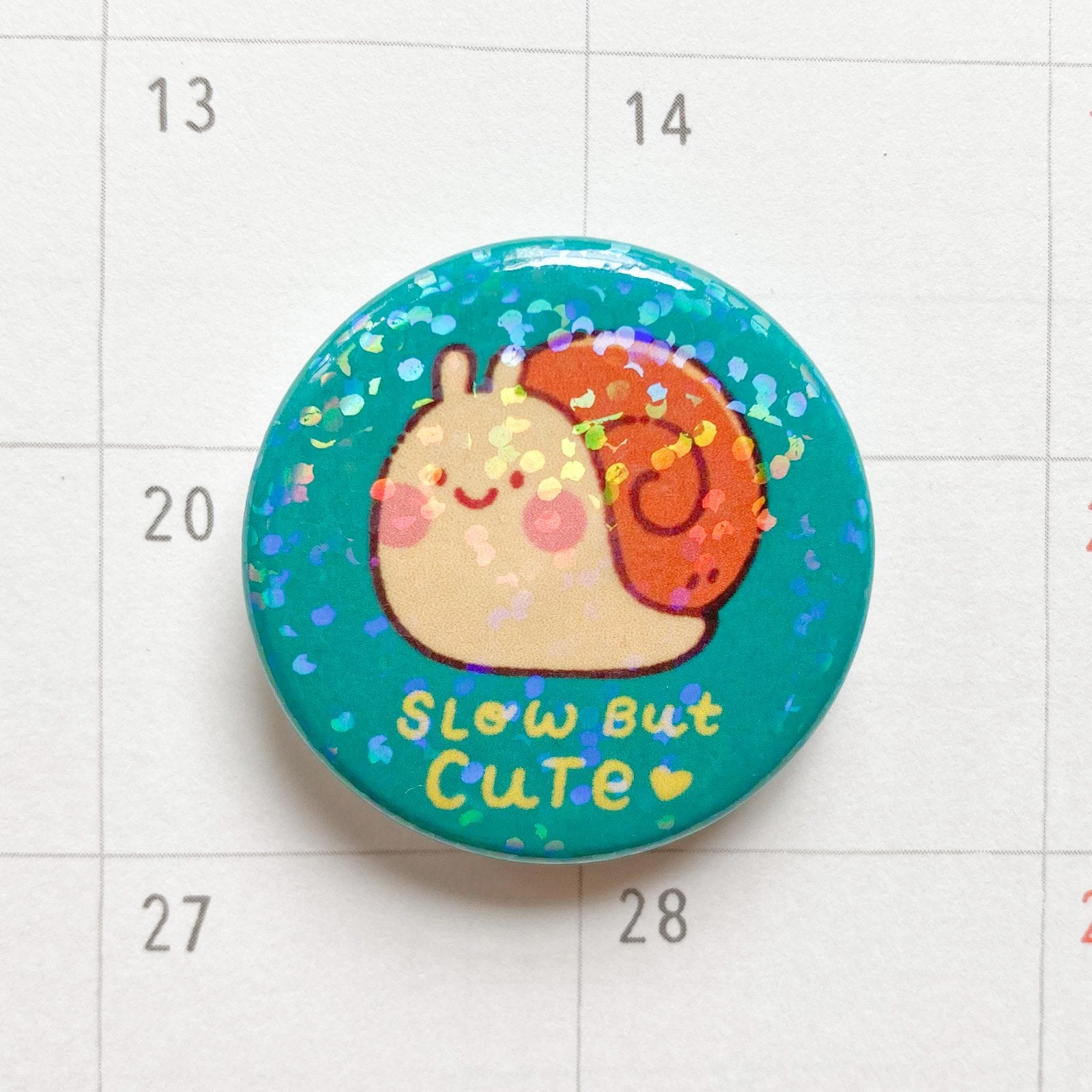 That's right, cutie--take your time! An adorable mini button pin with holographic finish.
