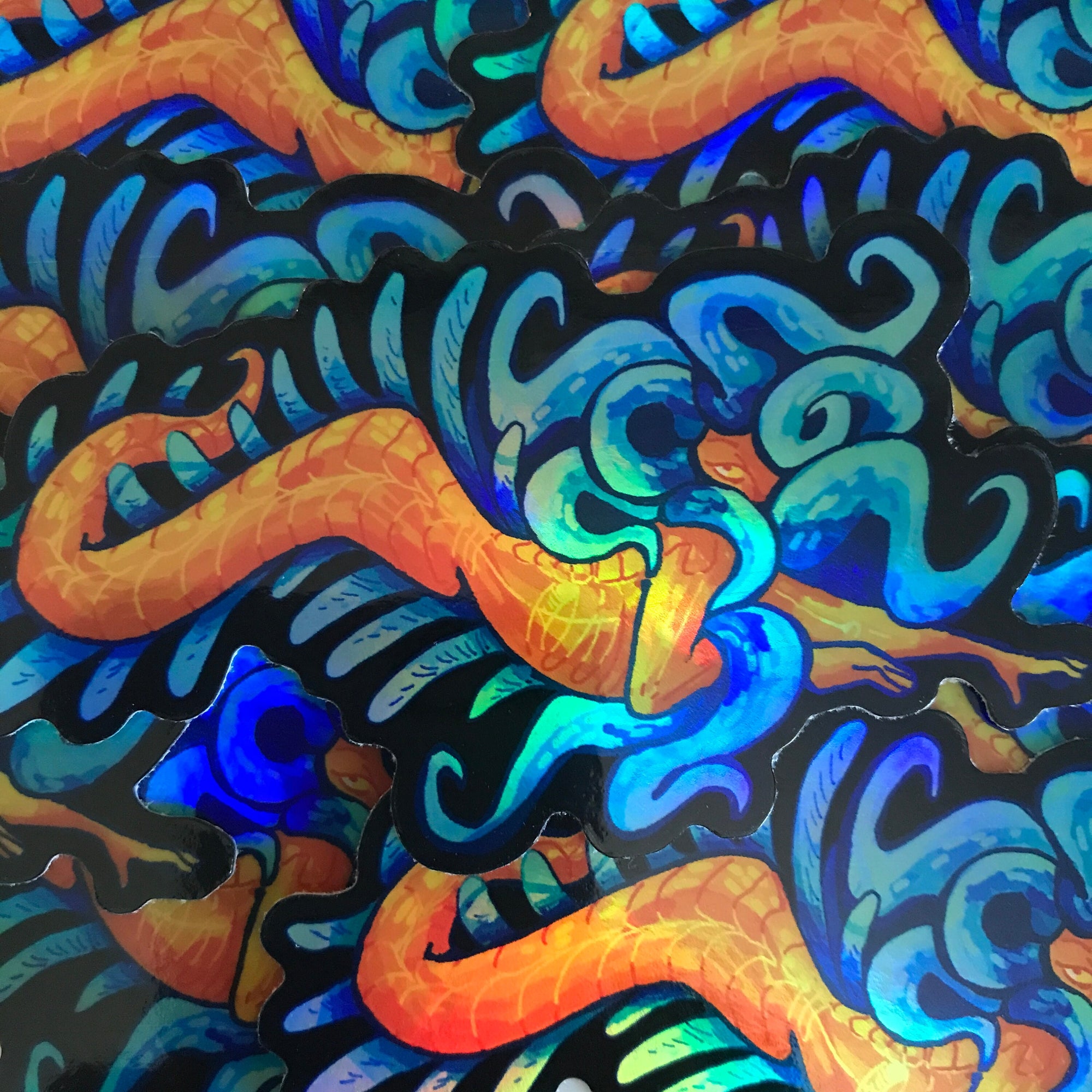 A squidworm mermaid from Mermay 2022.This sticker is approximately 3 inches (7.6 cm) on the longest side, and printed on glossy holographic vinyl.
