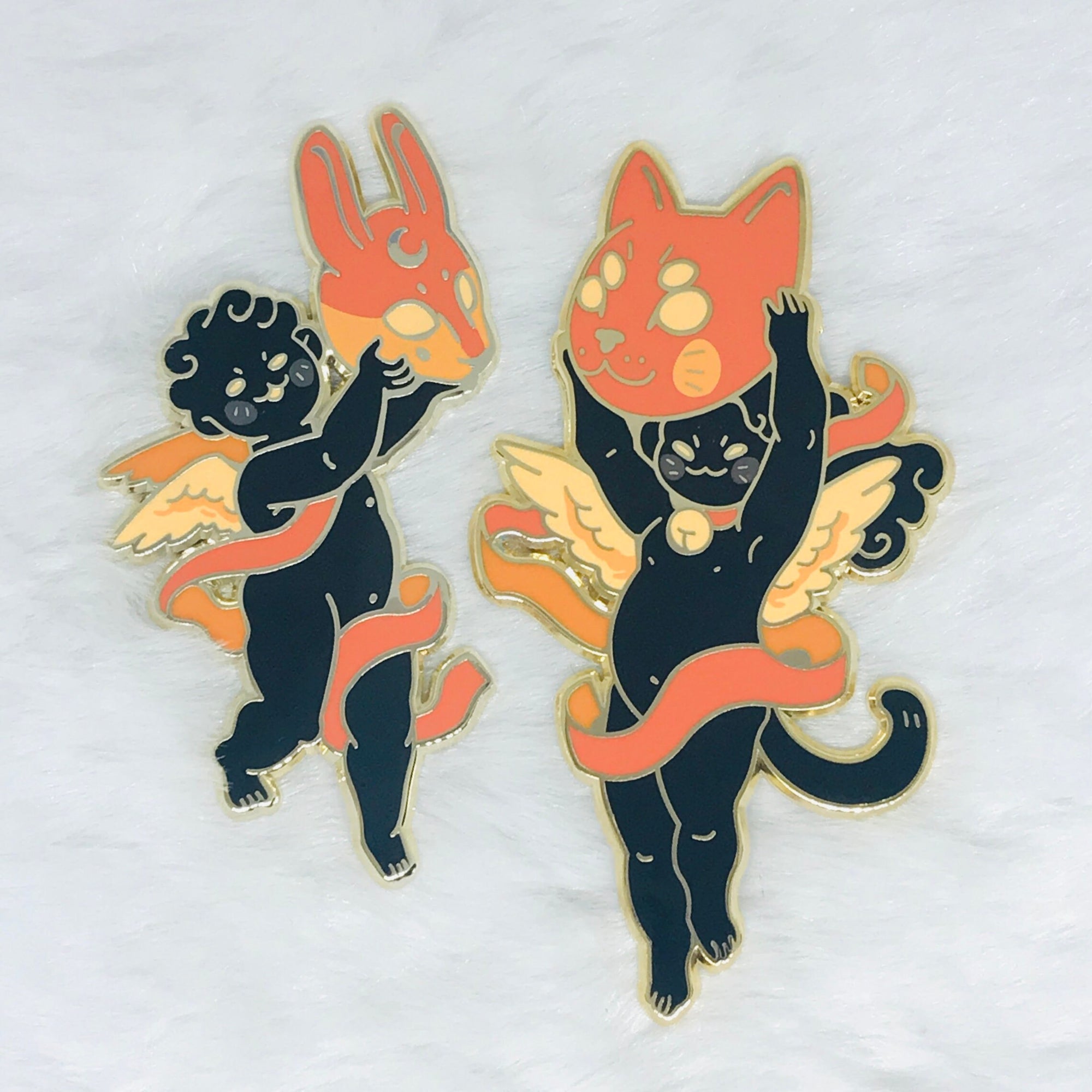 Little putti (cherubim) for the Year of the Rabbit and the Year of the Cat.Each pin is 2 inches (5 cm) long with gold plating and screenprint. They have two pin posts and rubber backings. This listing is for mixed grade pins. You may receive a standard grade pin, which has minimal or no flaws; or a seconds grade pin, which may have more notable flaws. For my complete pin grading policy, please see my About & FAQ: linktr.ee/ultra.infinite