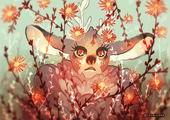 Features a deer sorrounded by red aster blossoms. Printed on Satin 260gms paper.