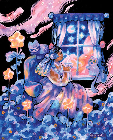 time to enjoy some sleepy tea with cats and the night sky as company.