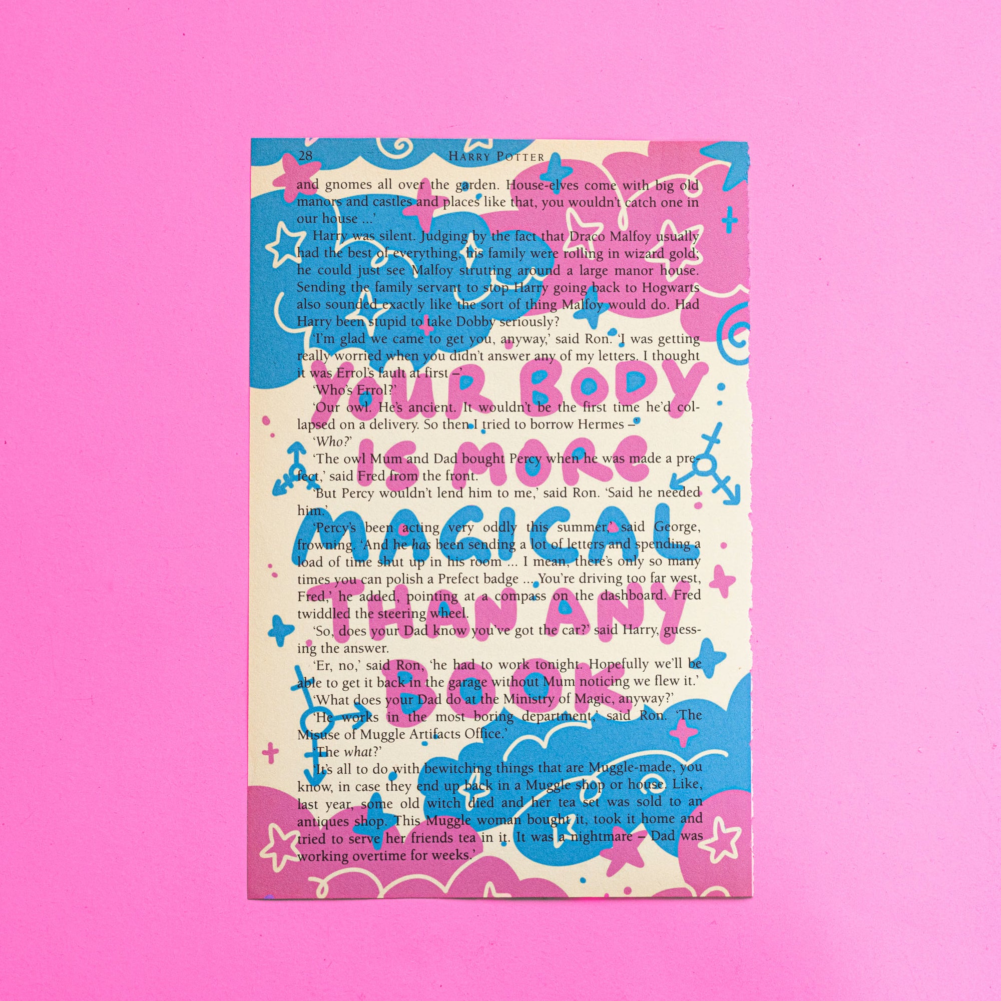 Printed on reclaimed pages of magical wizard parchment, this artwork transforms these pages into a celebration of the strength and story of trans people and communities on Trans Day of Visibility.