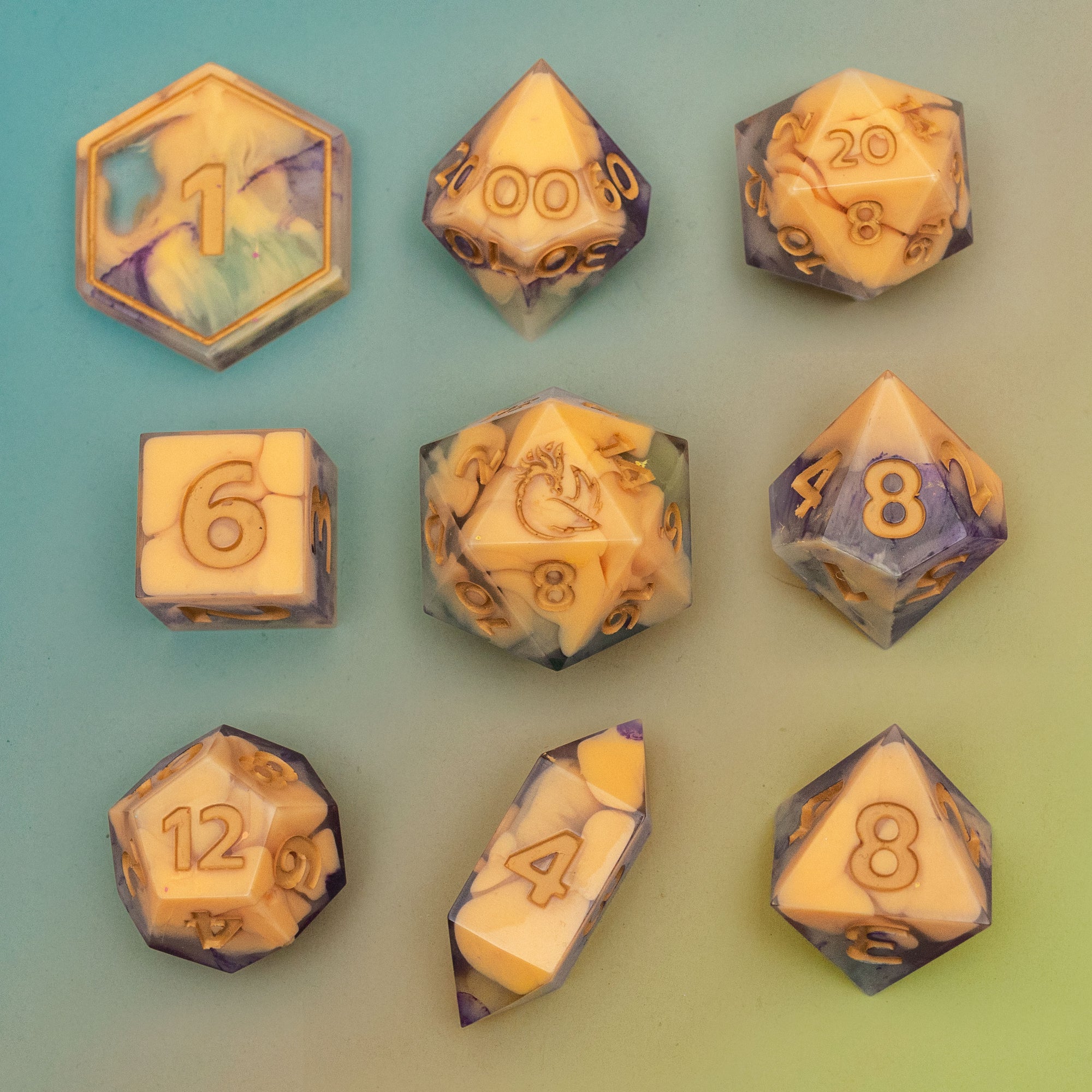 Please Note: All dice are handmade, and as such, may have small imperfections, but will not effect the gameplay nor the rolls of the die itself. I will endeavor to note any marks contained in each set, if they are present.