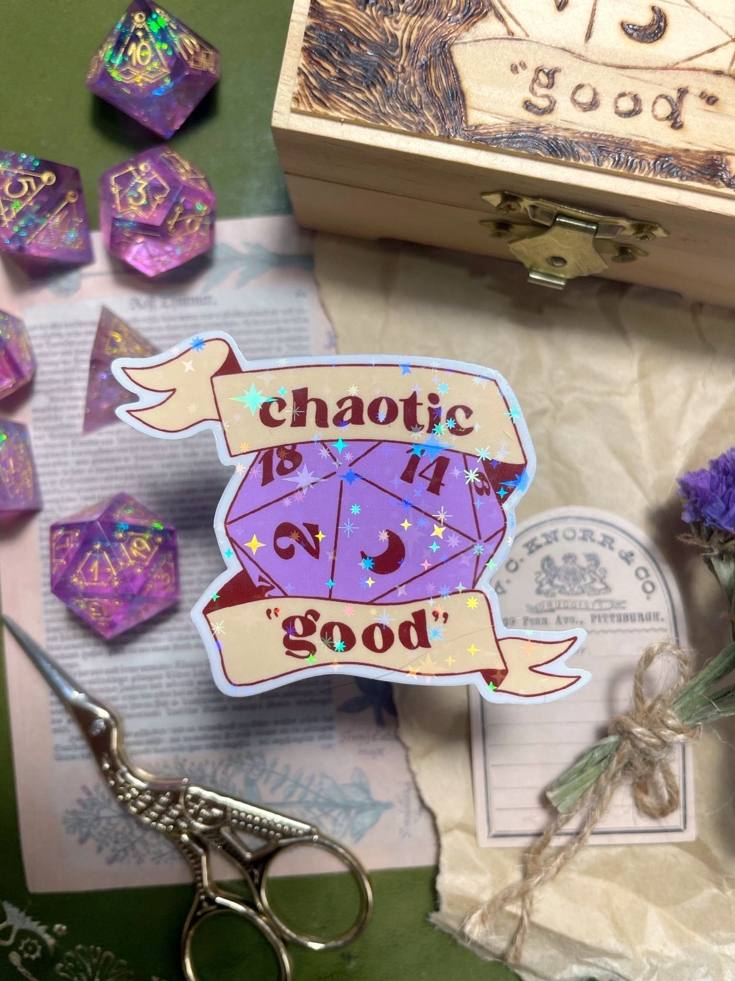Chaotic "Good" is my alignment, rep this cool sticker if it's also yours! Printed on high quality vinyl with a sparkly holographic stardust finish. Water proof, UV resistant and dishwasher safe!