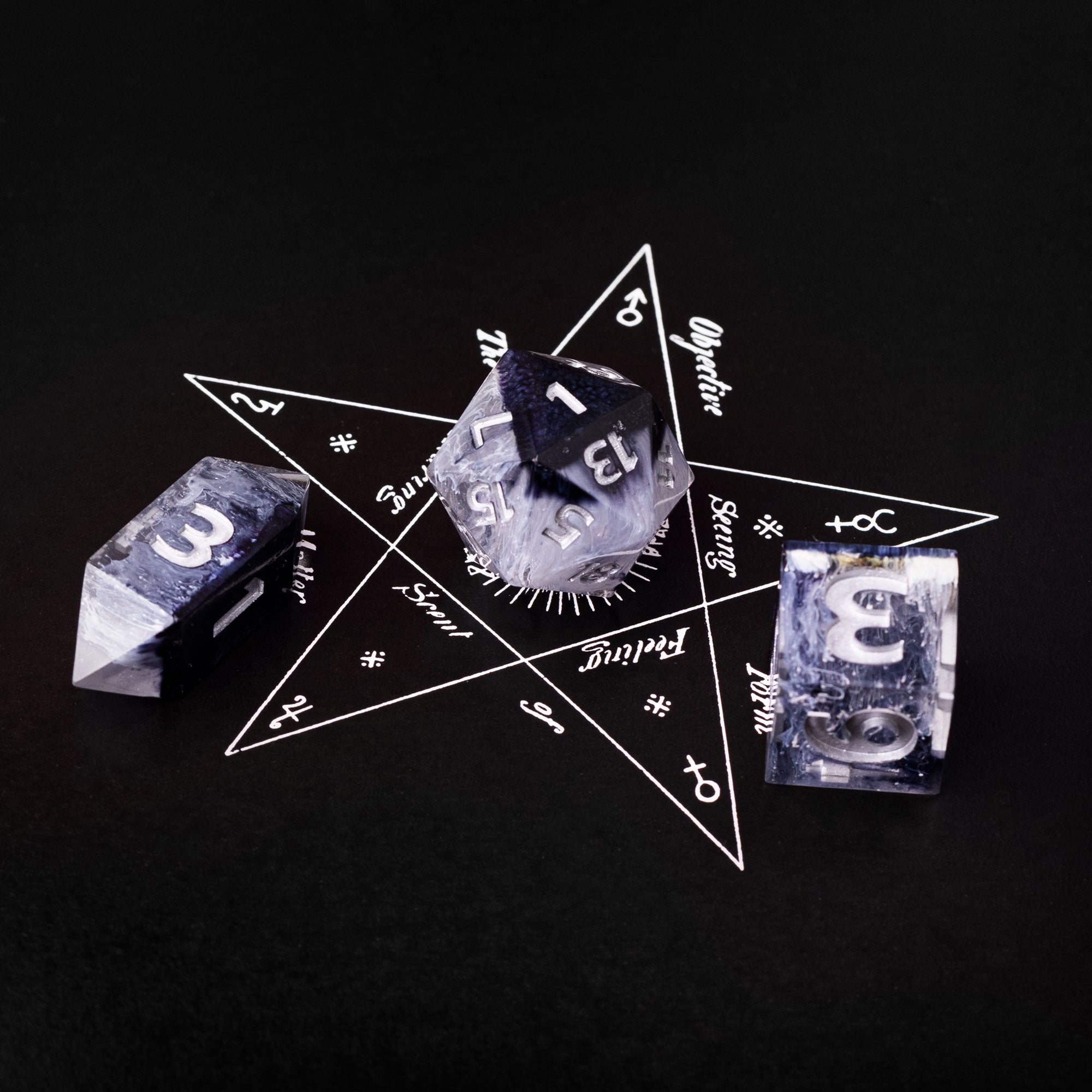 Please Note: All dice are handmade, and as such, may have small imperfections, but will not effect the gameplay nor the rolls of the die itself. I will endeavor to note any marks contained in each set, if they are present.