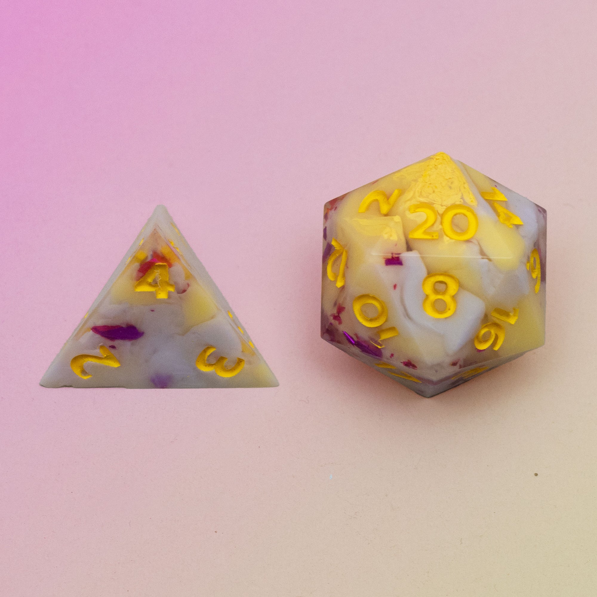 Please Note: All dice are handmade, and as such, may have small imperfections, but will not effect the gameplay nor the rolls of the die itself. I will endeavor to note any marks contained in each set, if they are present.