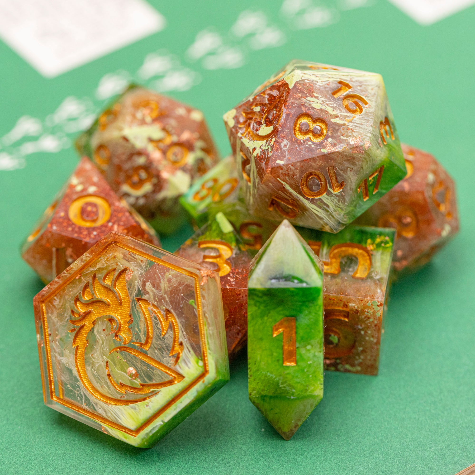 Please Note: All dice are handmade, and as such, may have small imperfections, but will not effect the gameplay nor the rolls of the die itself. I will endeavor to note any marks contained in each set, if they are present.
