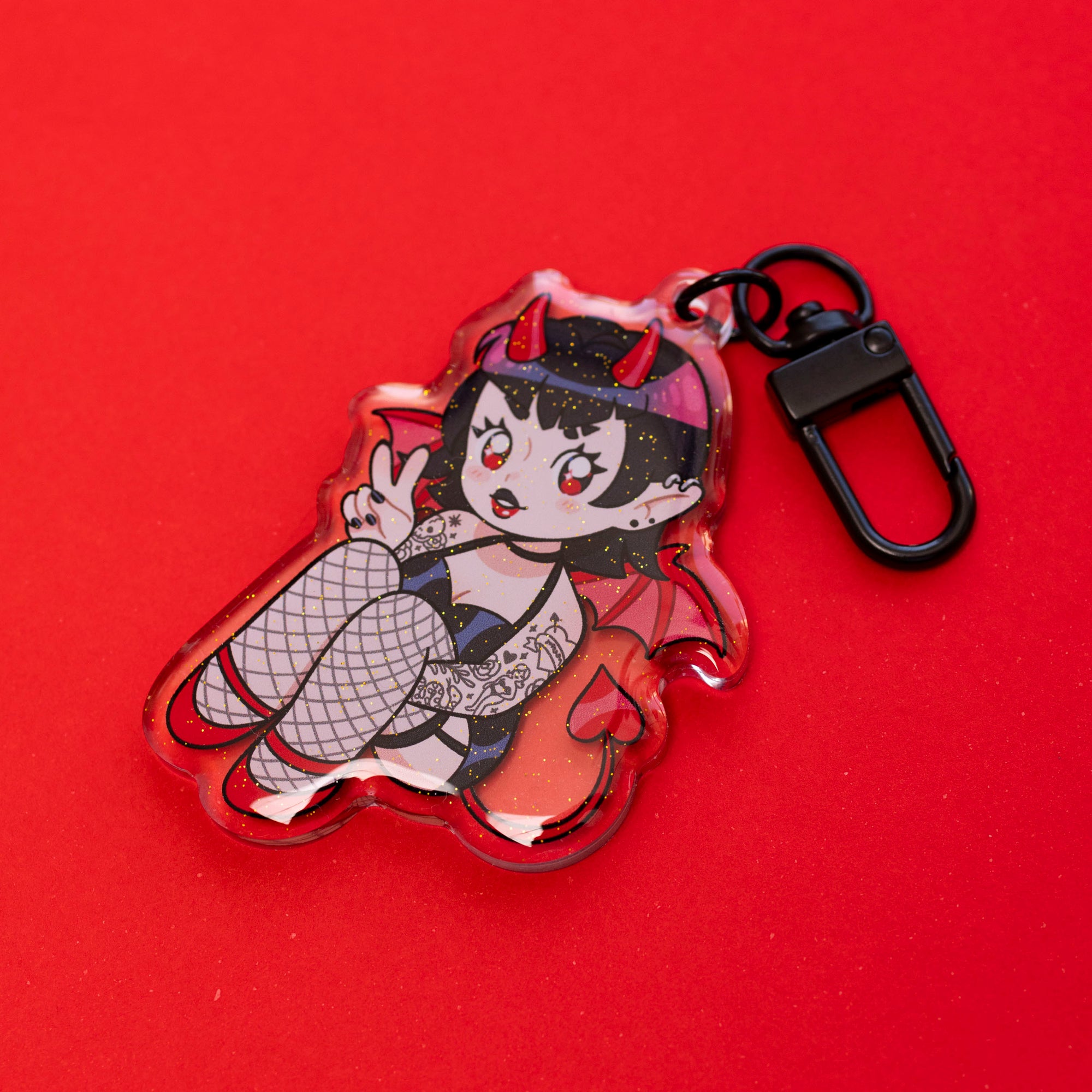 This cute devil acrylic keychains is double-sided and measures 2.5” tall. It has a glitter epoxy coating. Perfect for decorating your keys, backpack, tote bag, and more! PLEASE NOTE: most keychains have a plastic film on the back side that you will need to peel off.