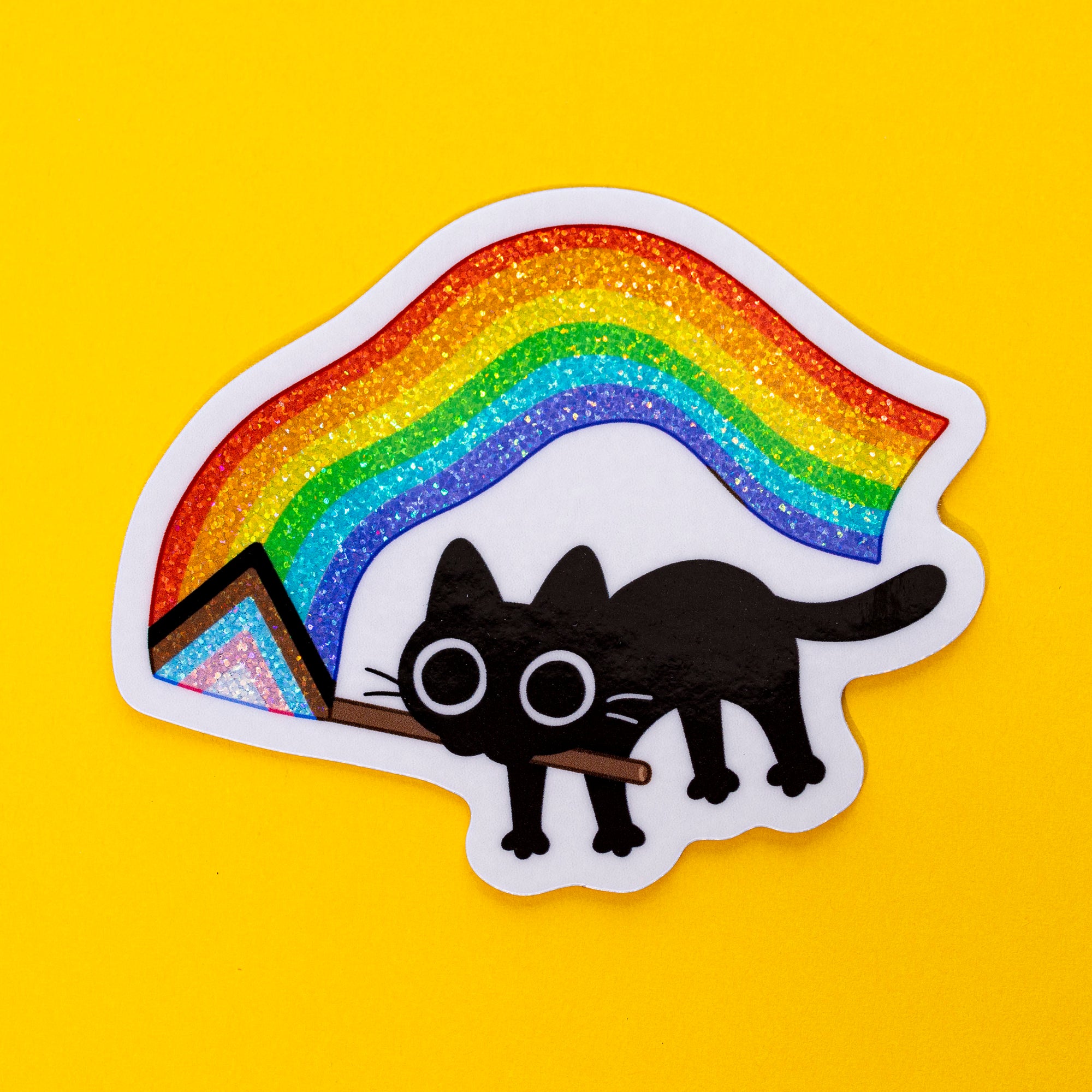 This pride black cat sticker 3” wide and has a holographic glitter finish. These stickers are perfect for decorating your laptop, water bottle, journal, and more!
