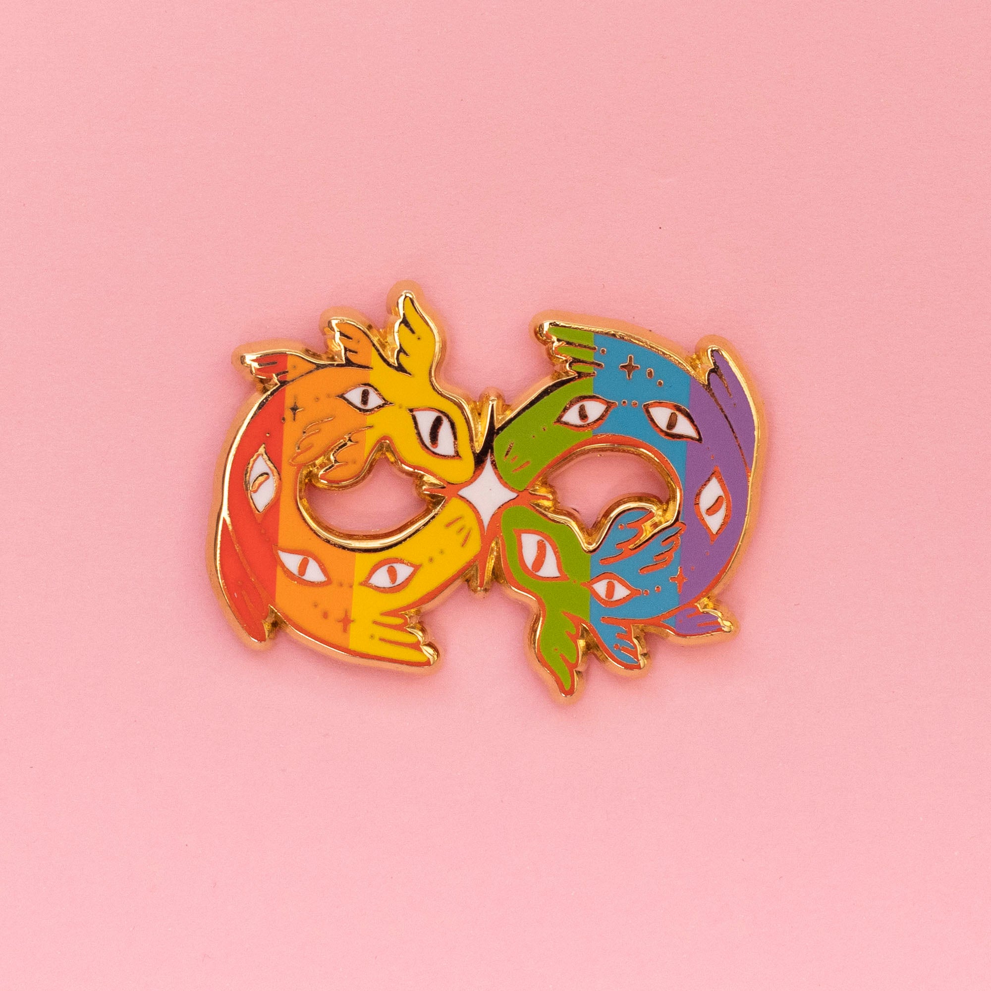 This pin is approximately 1.5 in (4 cm) wide. The pin has hard enamel, gold plating, and two pin posts with rubber clutches.