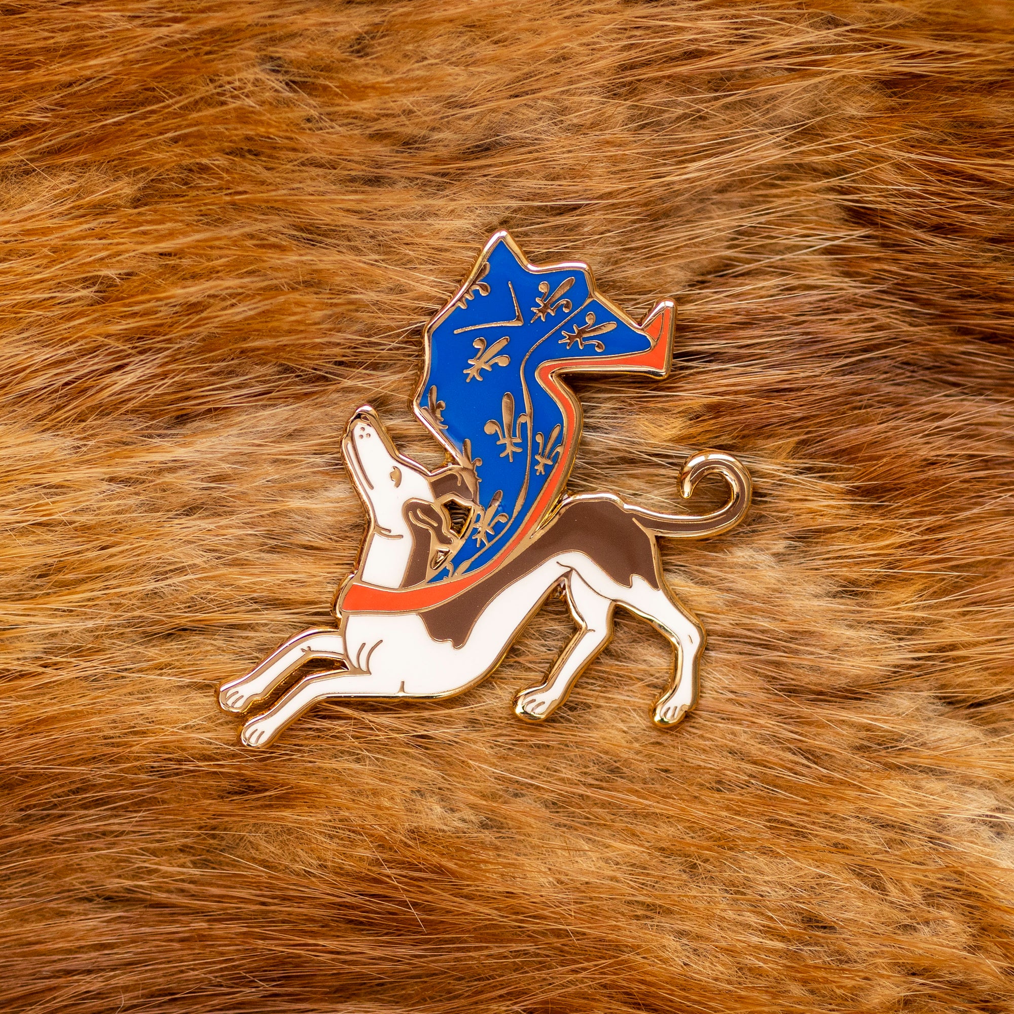 A very excited hound in a very fine cape! From an illumination depicting Isabella of France (Queen of England) returning to Paris. 1.9 inch hard enamel pin, gold plated, two posts, rubber clutches & back stamp.