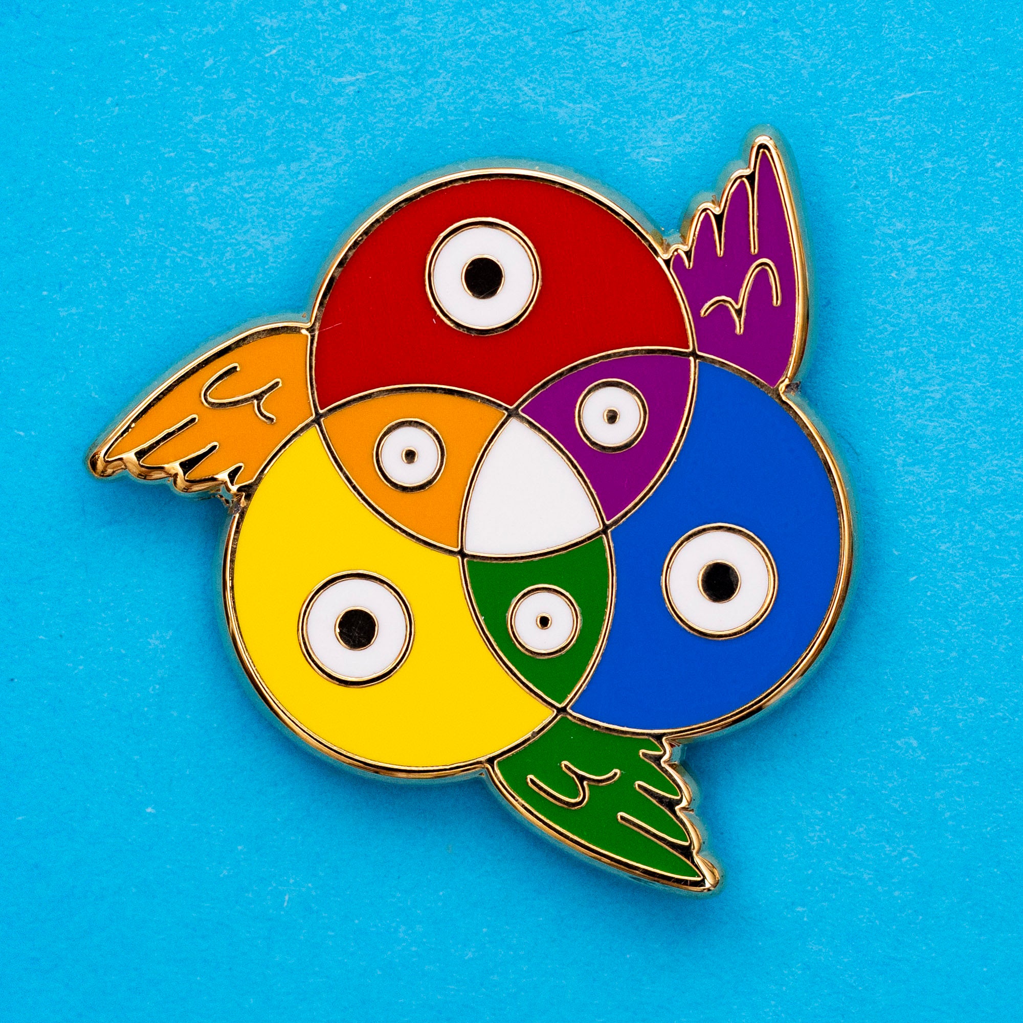 A trio of tiny ophanim, linked together to show off all the colors of the rainbow. Each pin is approximately 1 inches (2.5 cm) long. Each pin has rubber clutches, hard enamel, and gold plating.
