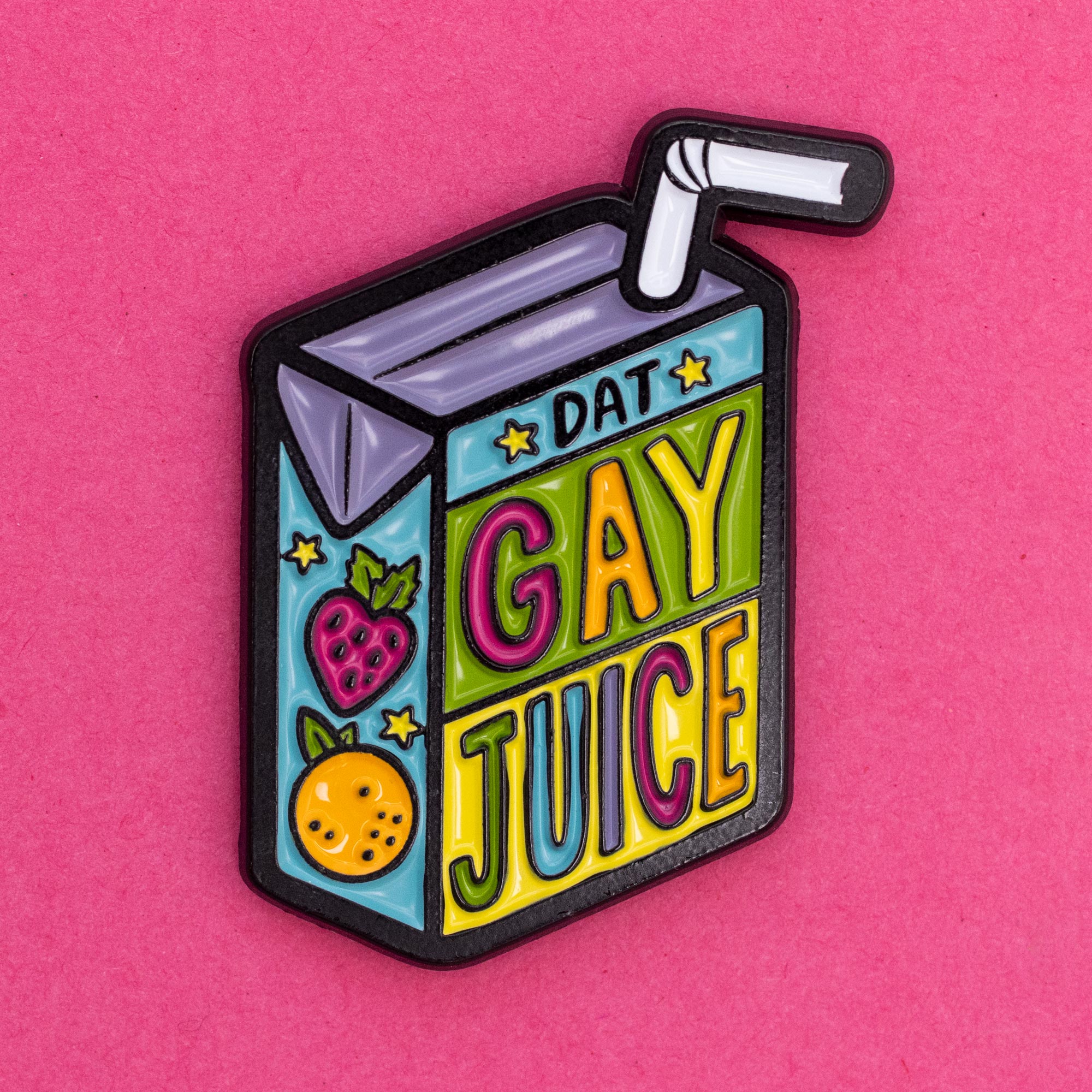 Ah, that's refreshing. Gimme some of dat delicious fruity Gay Juice! This cute little matte black enamel pin features cute fruits, sweet stars, and of course, is designed to celebrate your queer identity in classic Trash Creature style