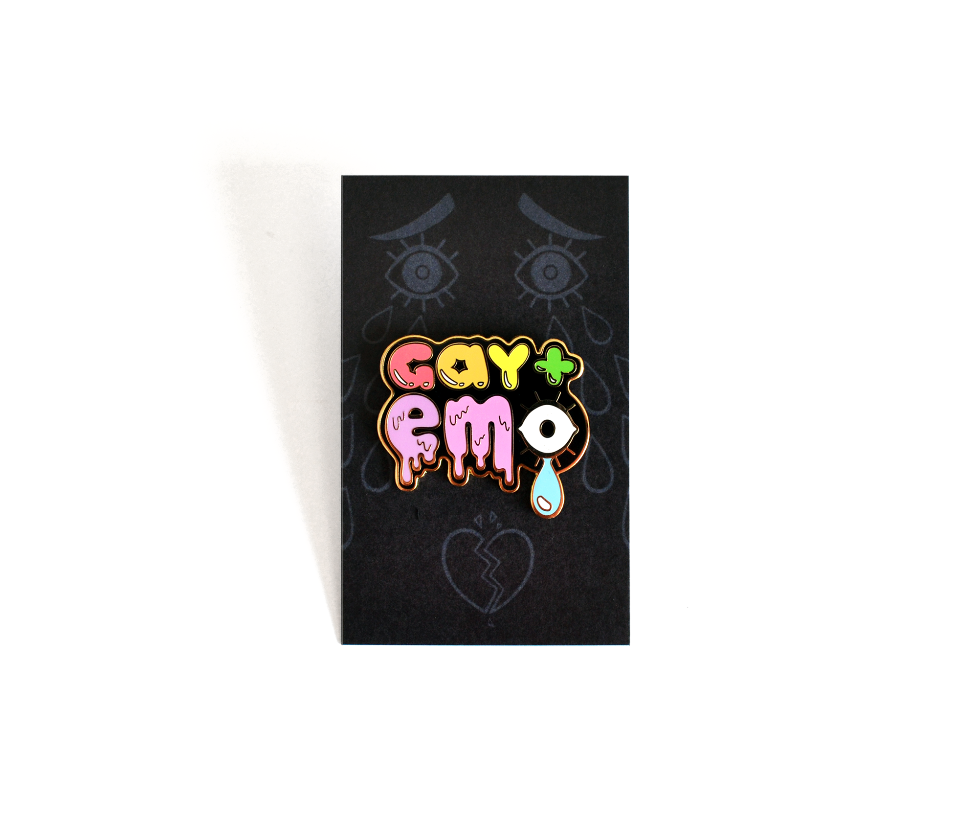 A 4cm gold-plated hardĀ enamel pin of the words "gay+emo" in rainbow bubble and melt font, with a crying eye design in place of the 'o'.