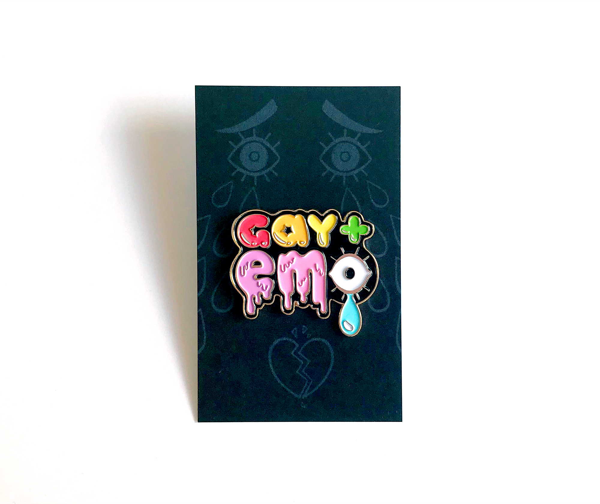 A 4cm gold-plated soft enamel pin of the words "gay+emo" in rainbow bubble and melt font, with a crying eye design in place of the 'o'.