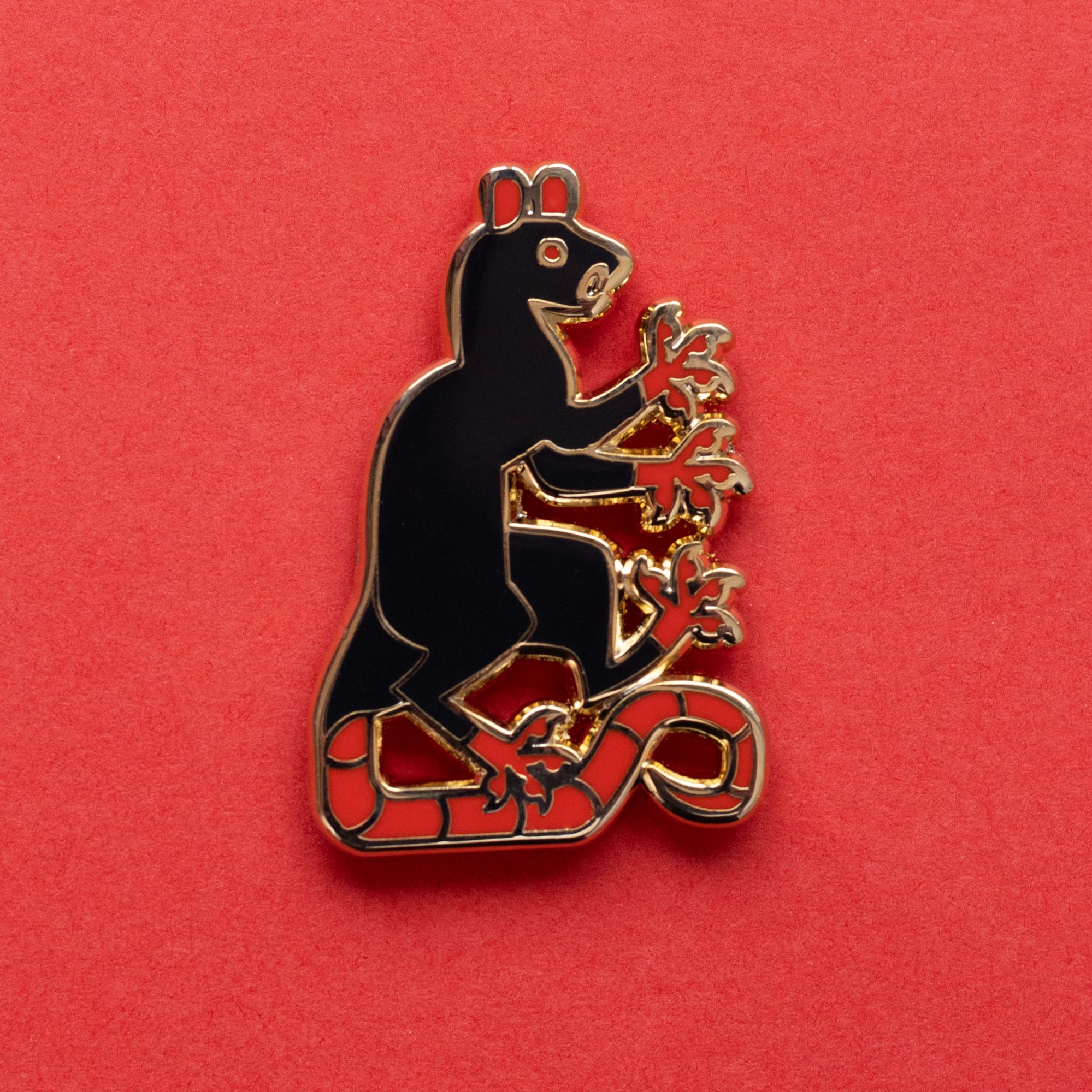Behold! The Heraldic Rat pin! Add a royal touch to your ratty style with this hard enamel pin, boasting a classic Heraldic design in gold plating. Join the court of Rattus and rock this regal rodent with pride! Hail to the Rat!