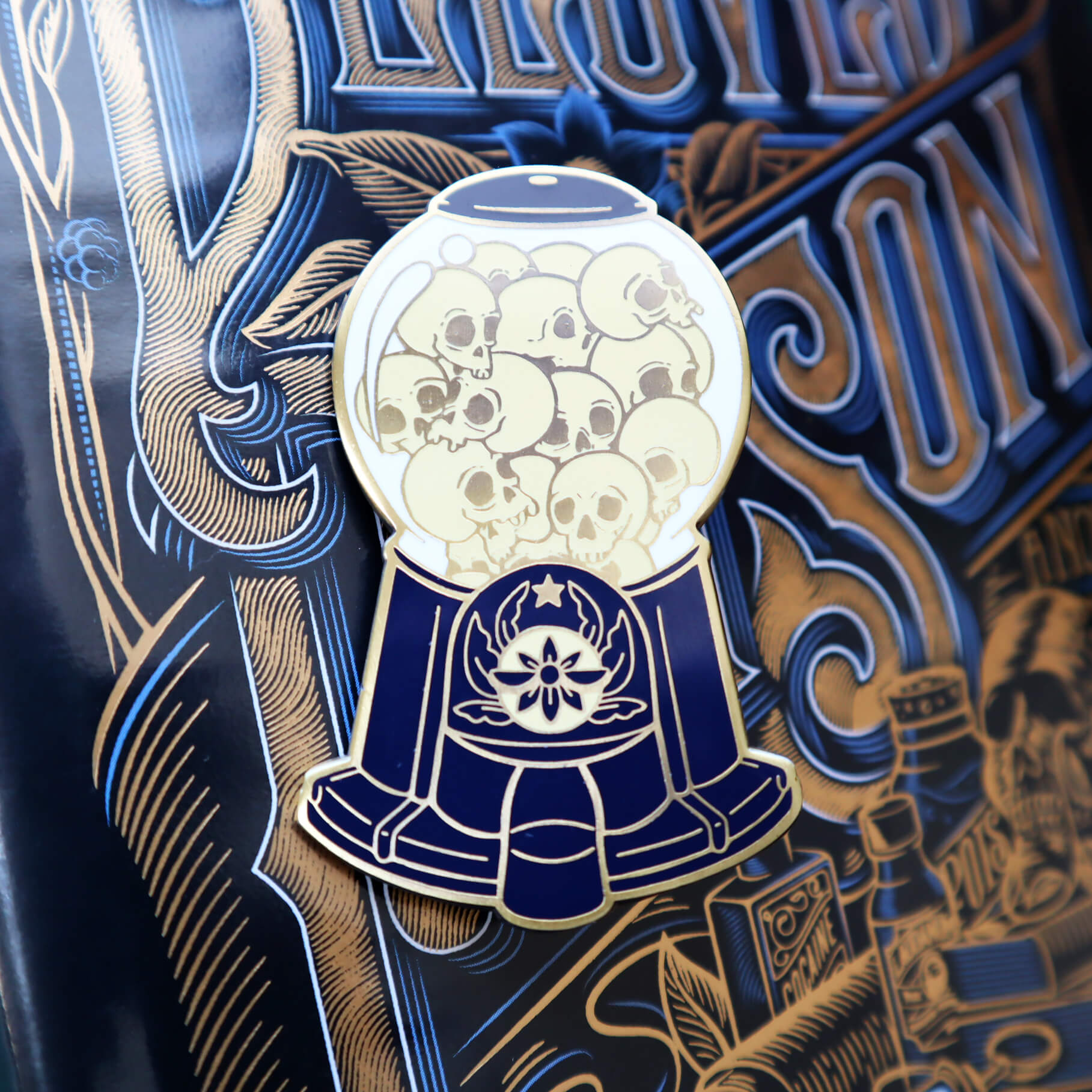 Look, it's a pile o' skulls in an old-school gumball machine. Who wouldn't want to rock that? This oversized pin is a fantastic standalone pin for a bag or shirt pocket, and is brushed to a velvety matte finish. Twin post with colour coordinated rubber clutches