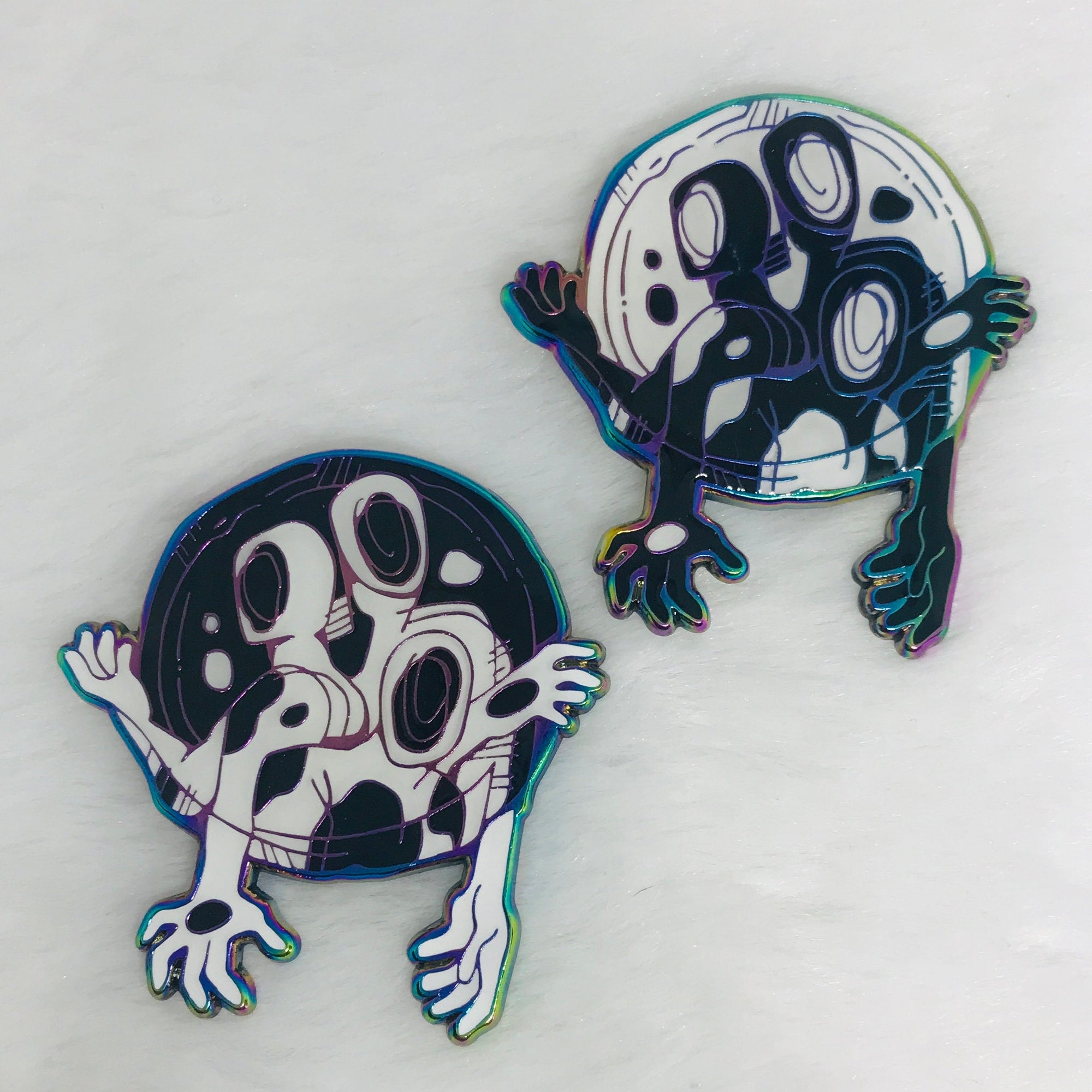 These pins are approximately 2 in (5 cm) long. Each pin has soft enamel with epoxy, rainbow plating, and two pin posts with rubber clutches. Rainbow plating is unique for every pin - no two are alike with differing metal colors. The plating may appear different than the example images shown in this listing.This listing is for mixed grade pins. You may receive a standard grade pin, which has minimal or no flaws; or a seconds grade pin, which may have more notable flaws. For my complete pin grading policy, please see my About & FAQ: linktr.ee/ultra.infinite