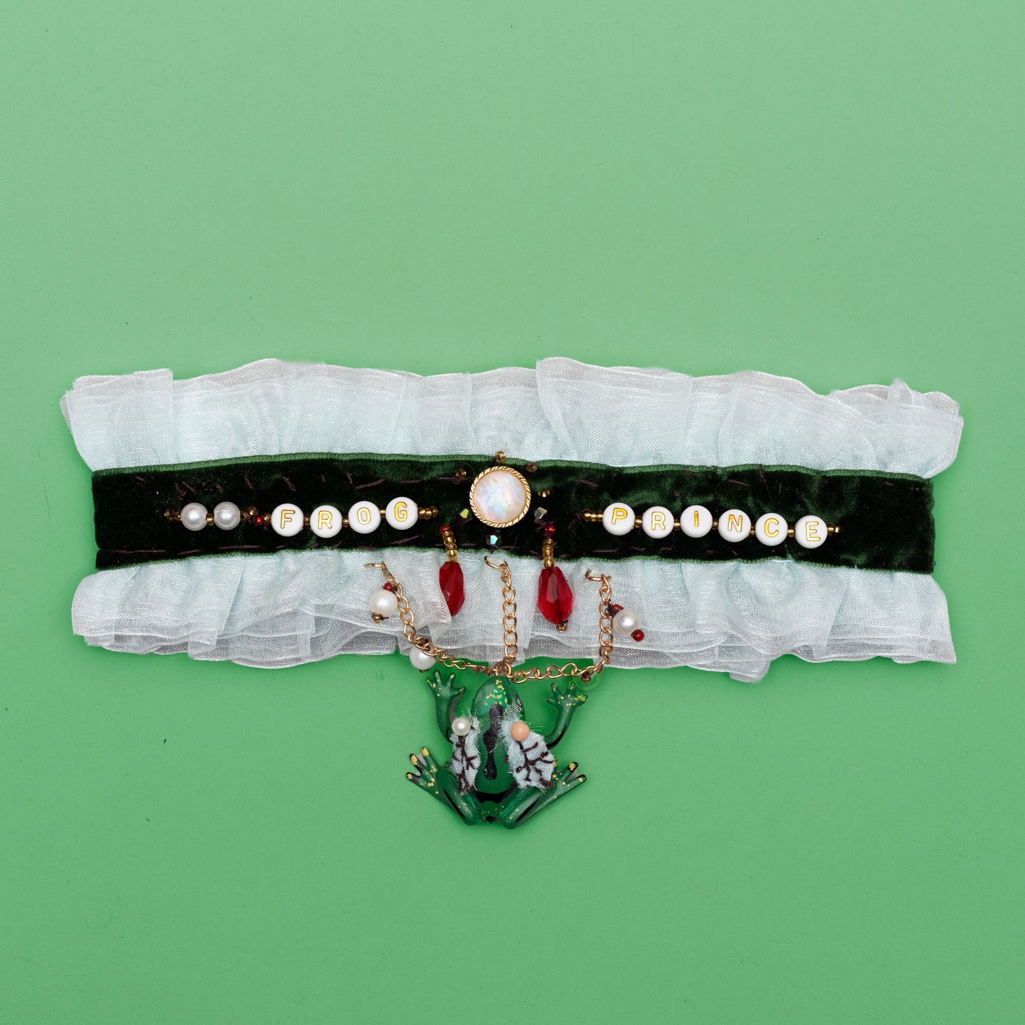 velvet ribbon, chiffon lace, plastic beading, metal chain, nylon thread and plastic toy frog