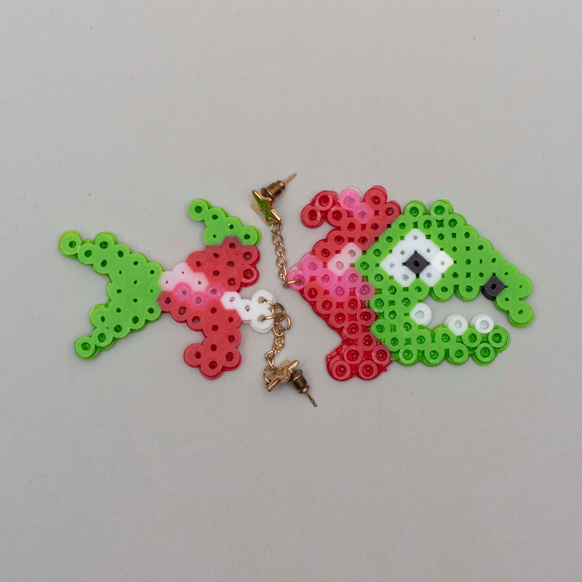 Two halves of a salmon dangling from a gold chain attached to simple gold star studs. This bright set is lightweight and unique.