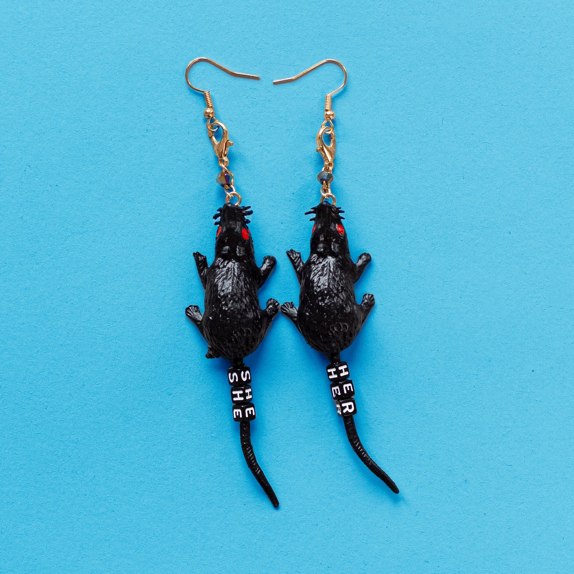 A delicate pair of rats showcasing she/herĀ pronouns, simple beading and gold metal chains. This pair is attached to lobster claw necklace clasps and so can be attached to anything the wearer desires.