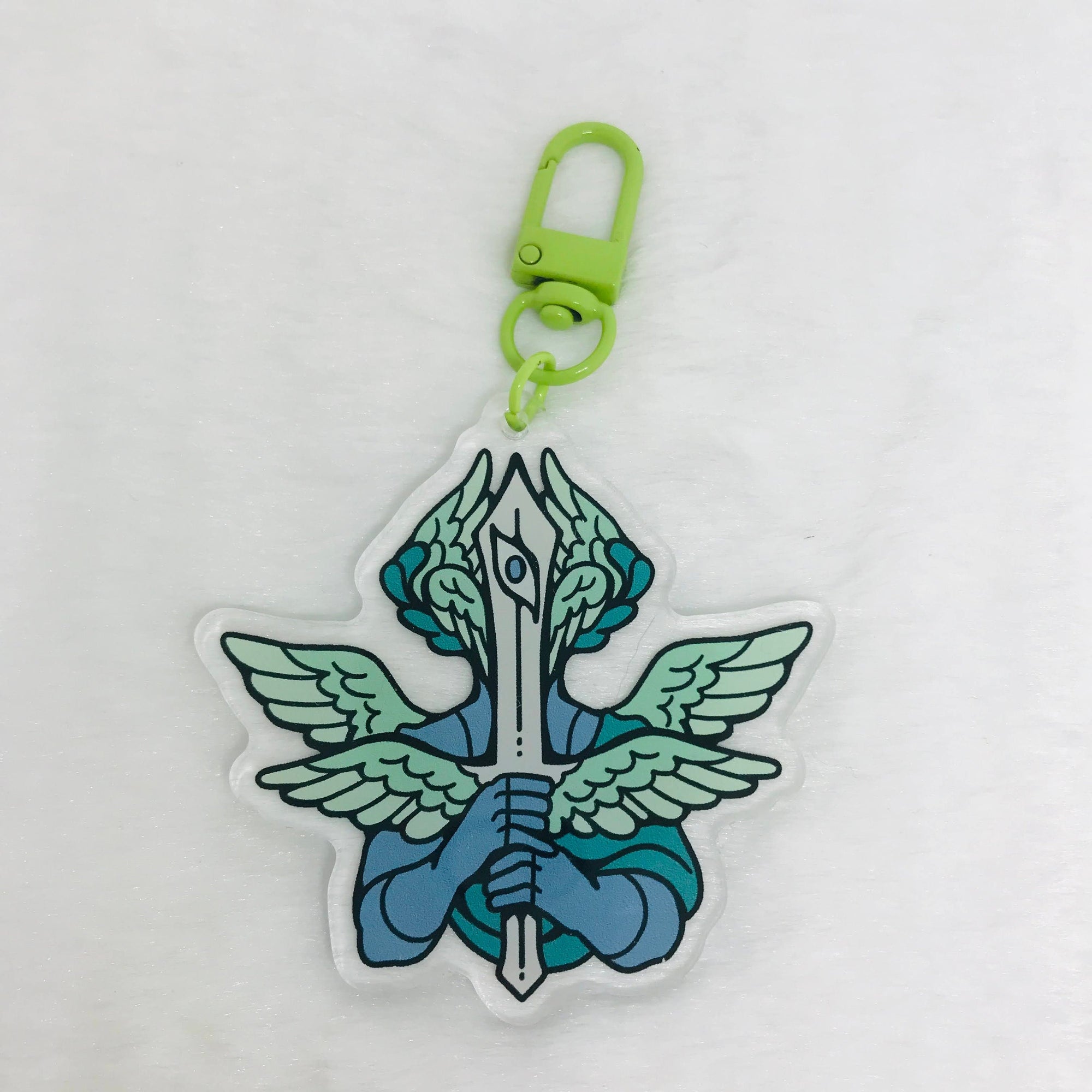 A pink and purple angelic sword, for Sapphic pride.This acrylic keychain is 2.5 inches (6.3 cm) long, double-sided with the same print on both sides. The keychain has a rose gold heart-shaped clasp.Please note: the keychain comes with protective film that should be peeled off.