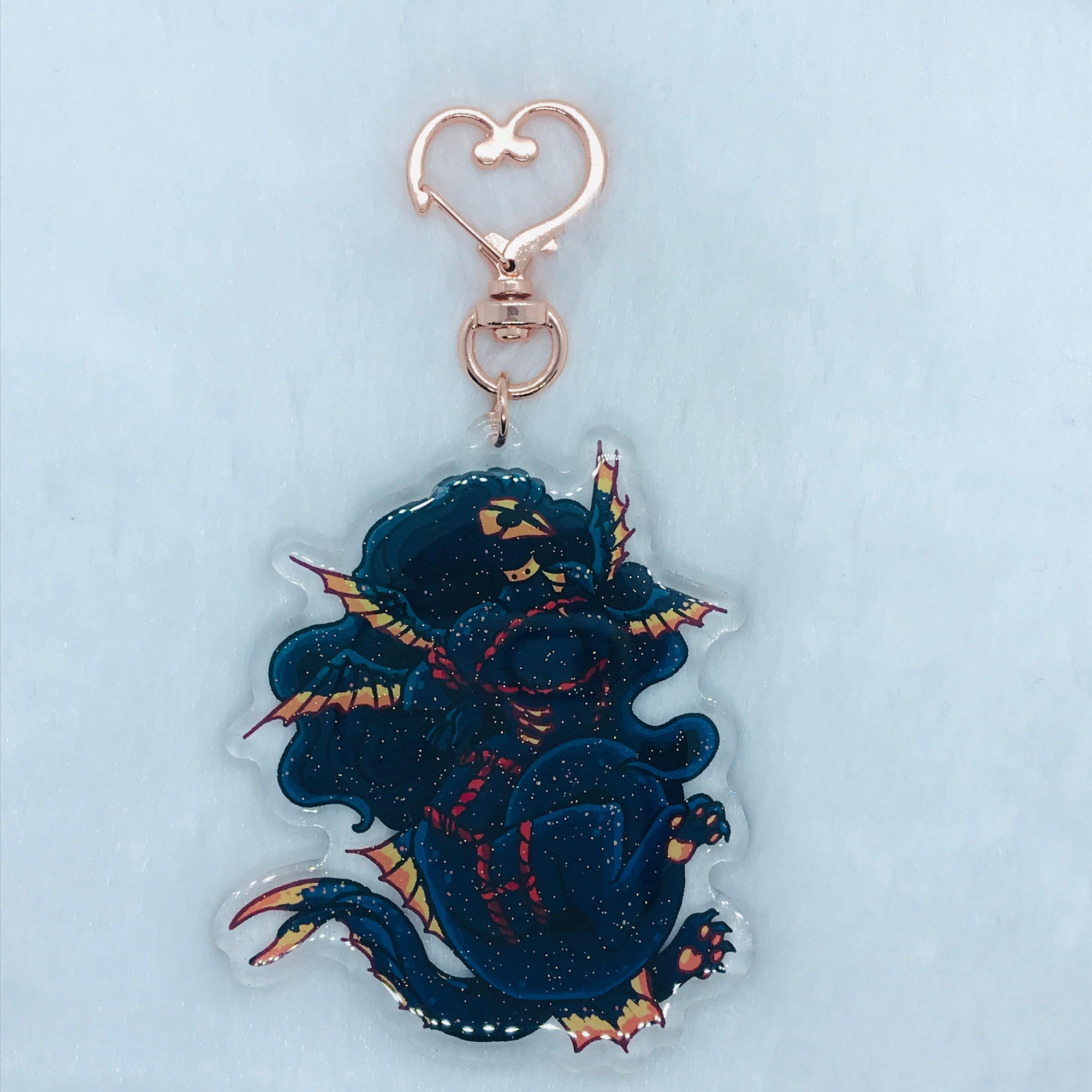My monster boy Atlas, all tied up in some shiny rope.This keychain is 3 inches (7.6 cm) long, with the same design on each side, and glitter epoxy on one side. The keychain has a rose gold heart-shaped clasp.