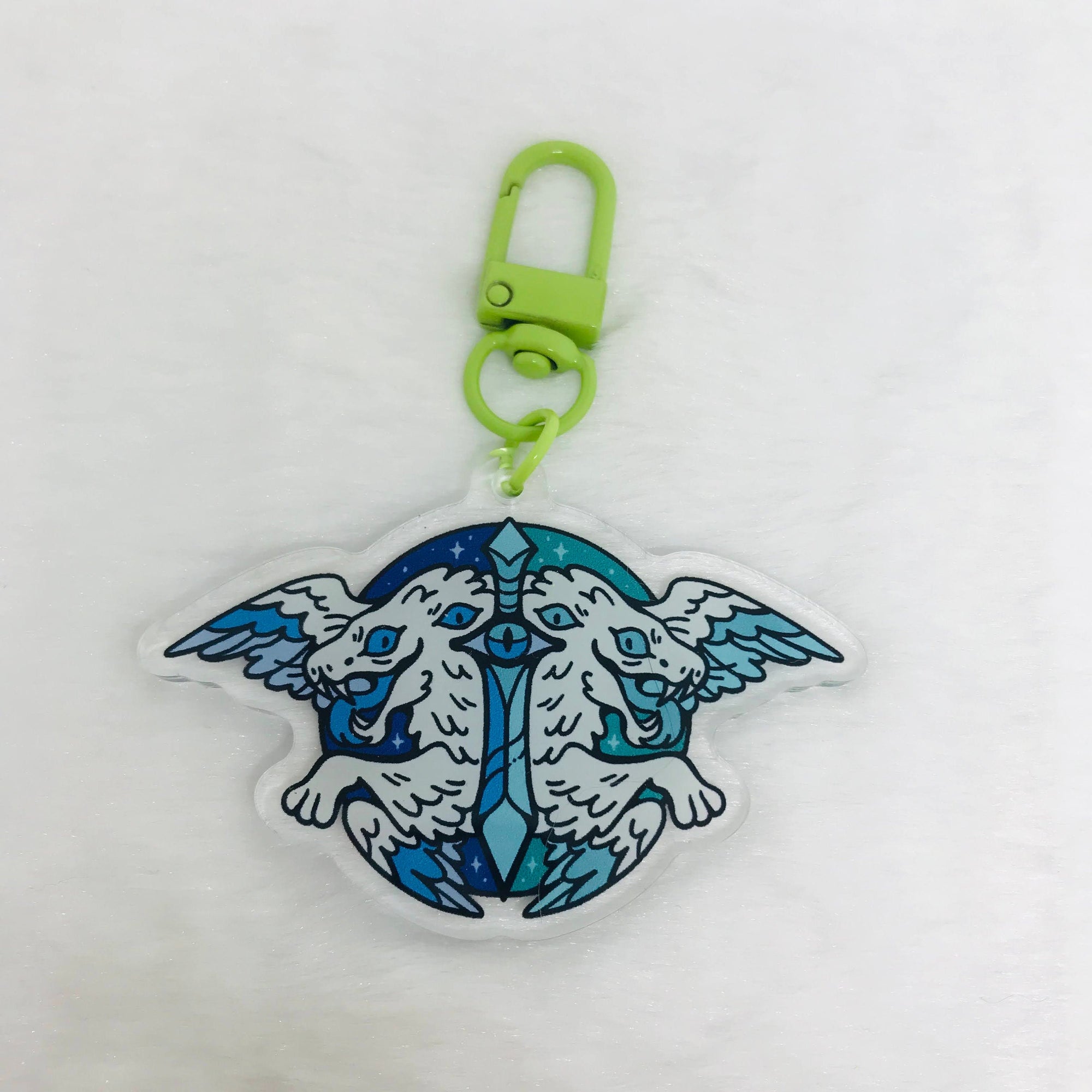 A two-headed gorgonops angel in blue and green, for Gay pride.This acrylic keychain is 2.5 inches (6.3 cm) long, double-sided with the same print on both sides. The keychain has a green lobster clasp.Please note: the keychain comes with protective film that should be peeled off.
