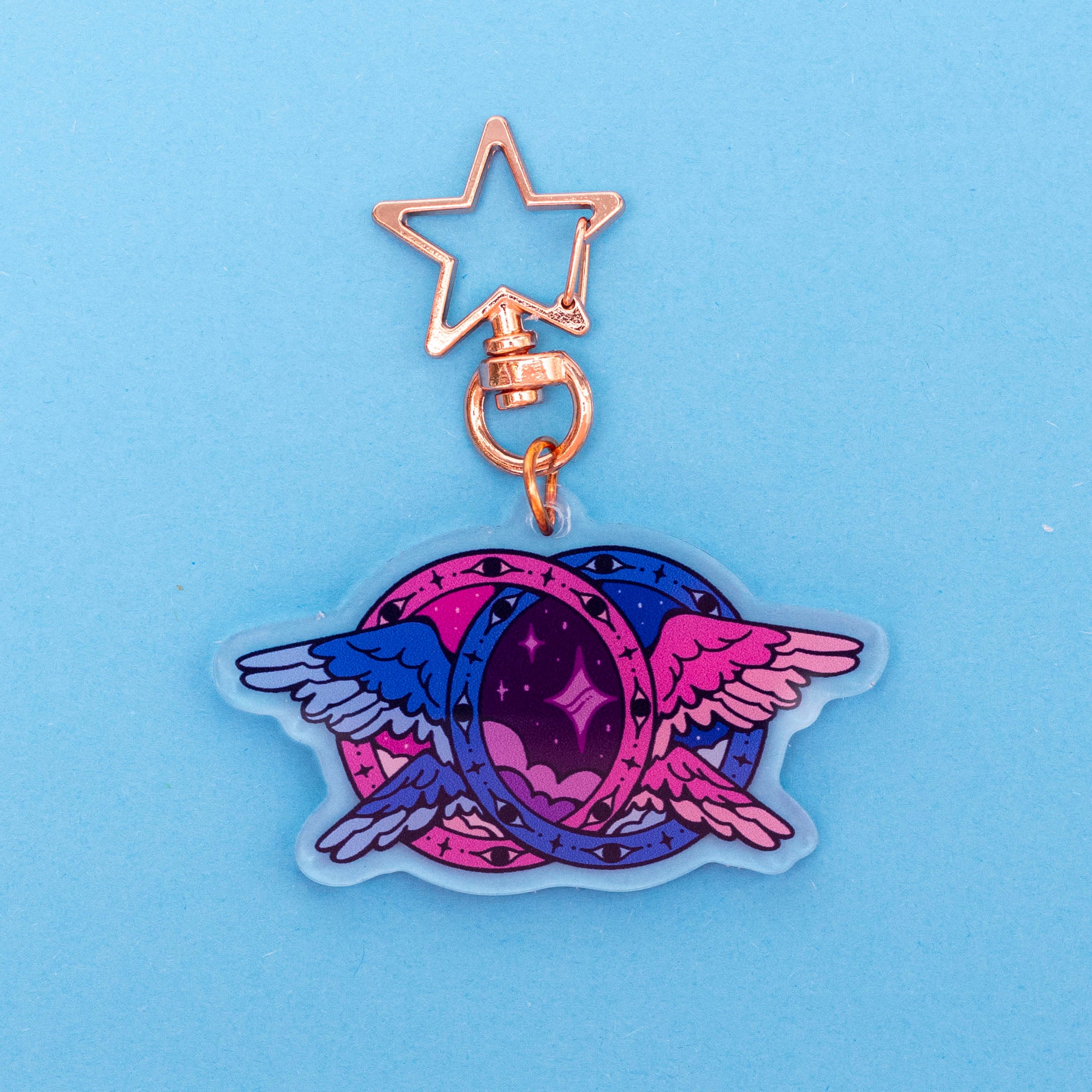 Entwined winged eyewheels, for Omnisexual pride. This acrylic keychain is 2.5 inches (6.3 cm) long, double-sided with the same print on both sides. The keychain has a rose gold star-shaped clasp.Please note: the keychain comes with protective film that should be peeled off.