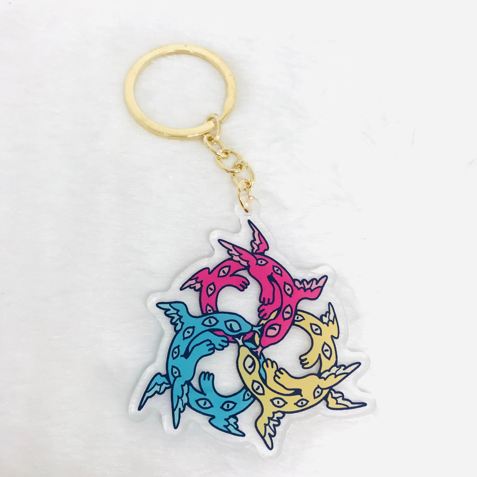 A trio of angelic serpents, for Pansexual pride.This acrylic keychain is 2.5 inches (6.3 cm) long, double-sided with the same print on both sides. The keychain has a gold circle clasp.Please note: the keychain comes with protective film that should be peeled off.