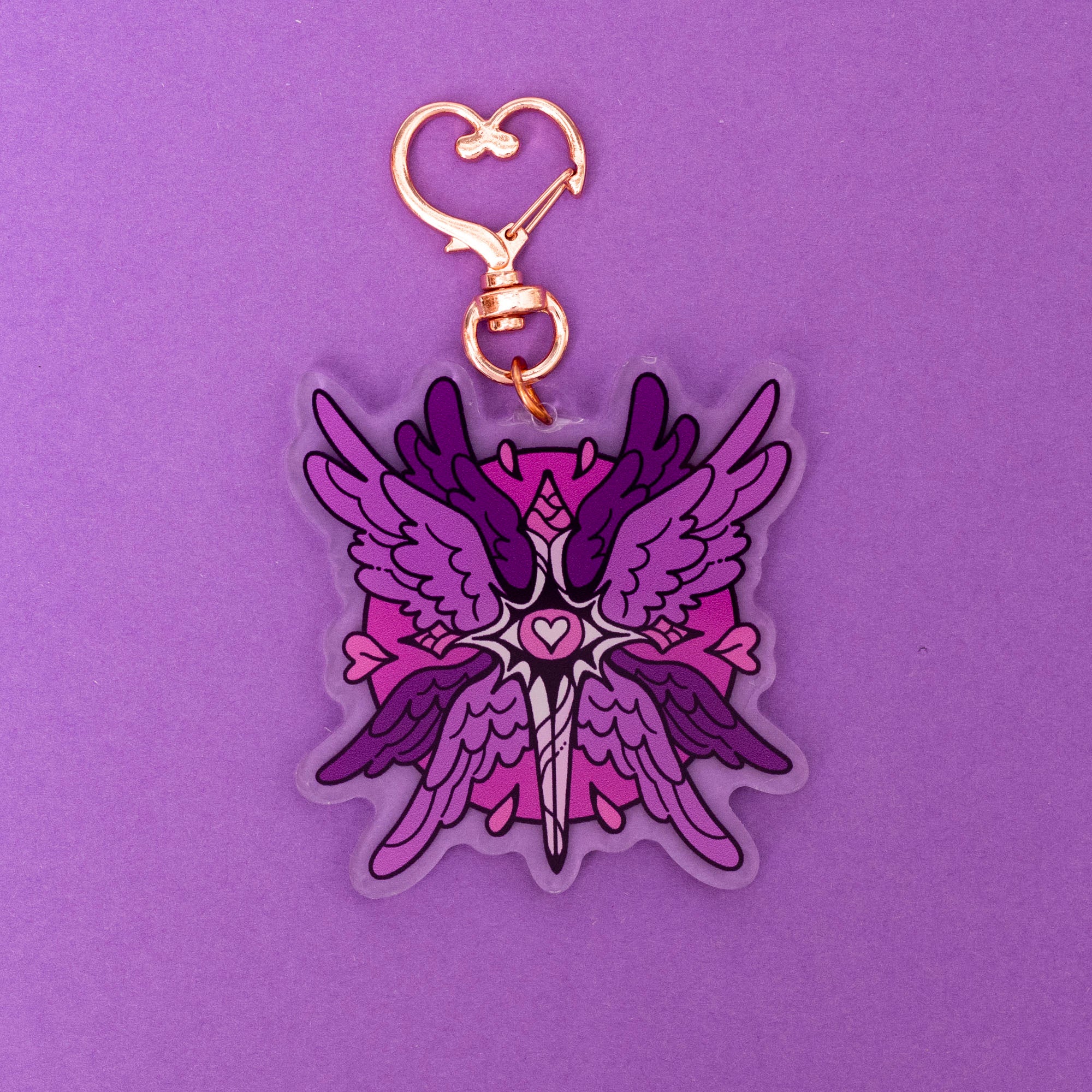 A pink and purple angelic sword, for Sapphic pride.This acrylic keychain is 2.5 inches (6.3 cm) long, double-sided with the same print on both sides. The keychain has a rose gold heart-shaped clasp.Please note: the keychain comes with protective film that should be peeled off.