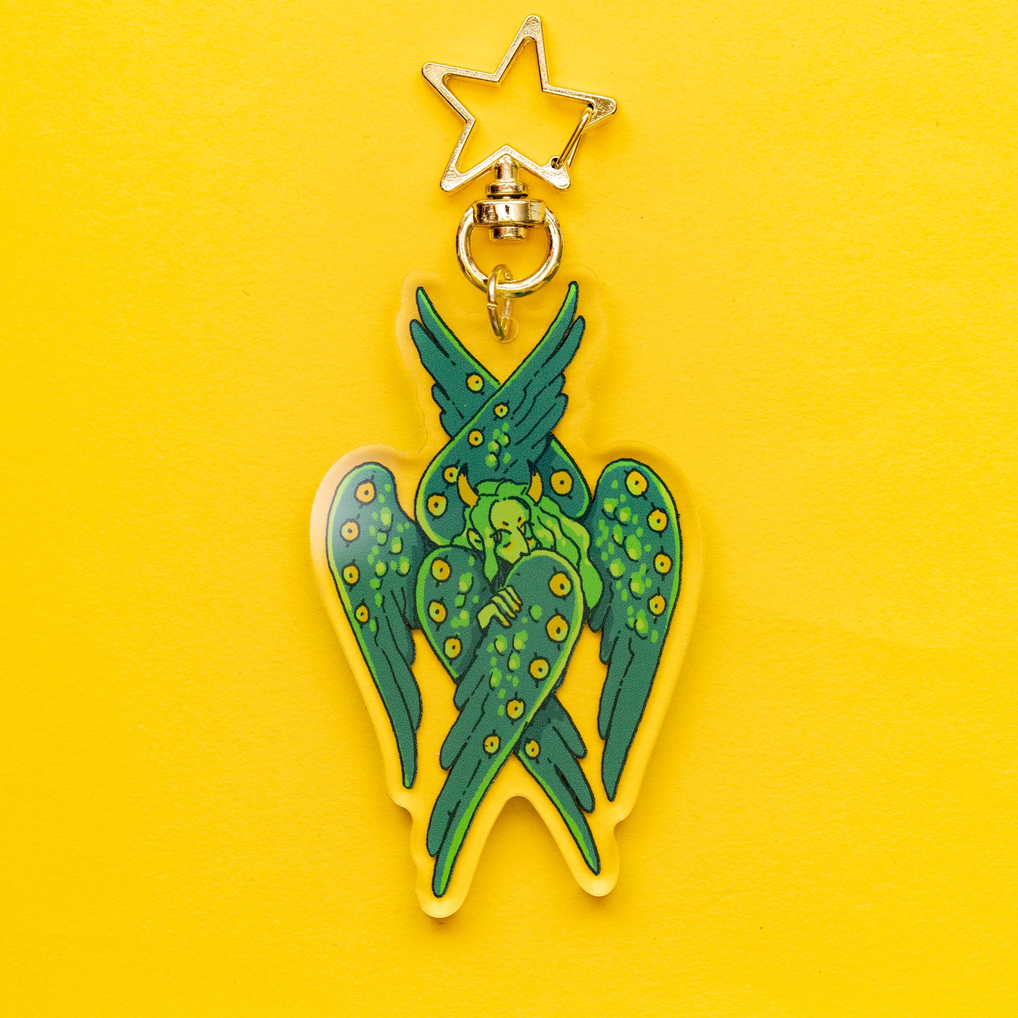 A timid seraph in hues of green.This keychain is 3 inches (7.6 cm) long with the same design on each side. The keychain has a gold star-shaped clasp.