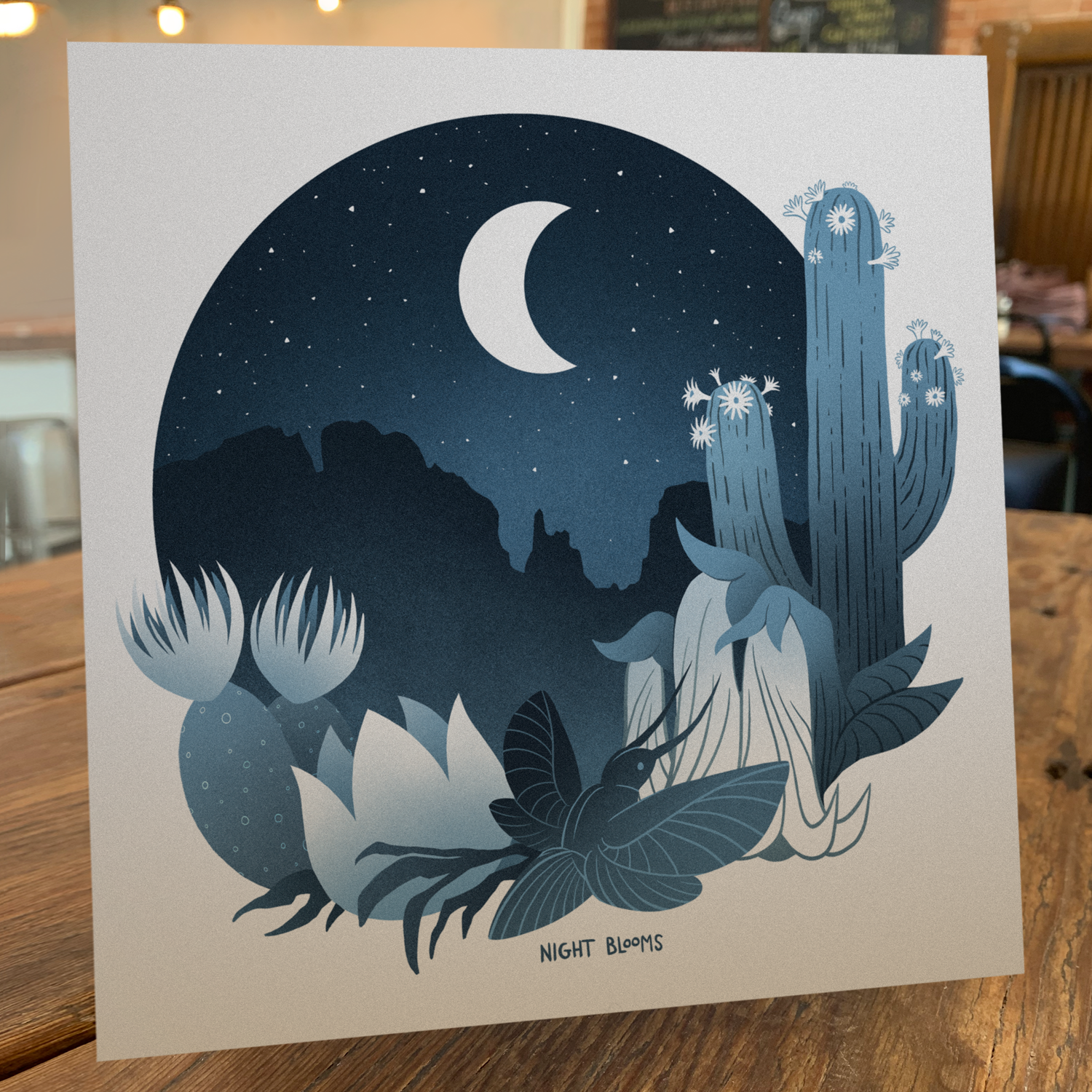 This 12" x 12" giclee print highlights the flora of the Sonoran desert night, along with one of its charismatic insects, the sphinx moth.