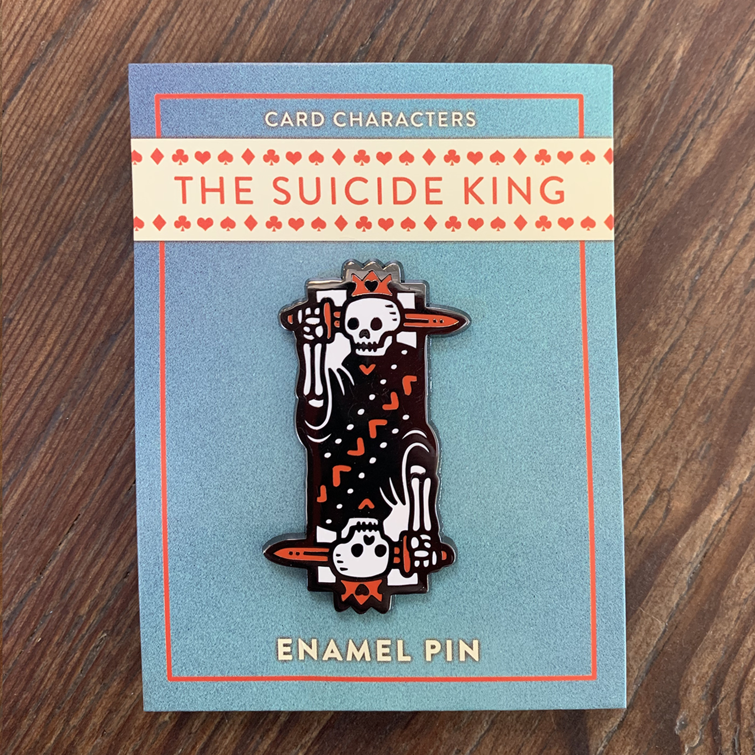 I've combined my love for cute lapel pins and playing card design history, with a small set of designs based off of some famous face cards! The "Suicide King" is named for the sword going through the head.