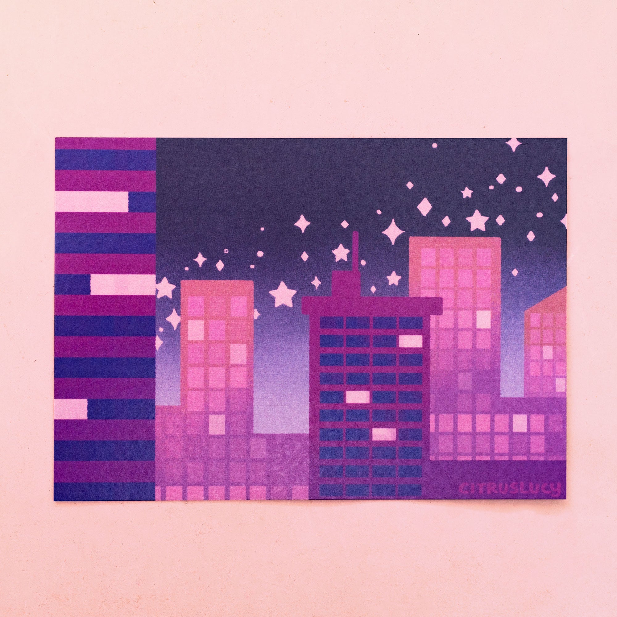 This postcard evokes the ace flag through a starry nighttime cityscape.