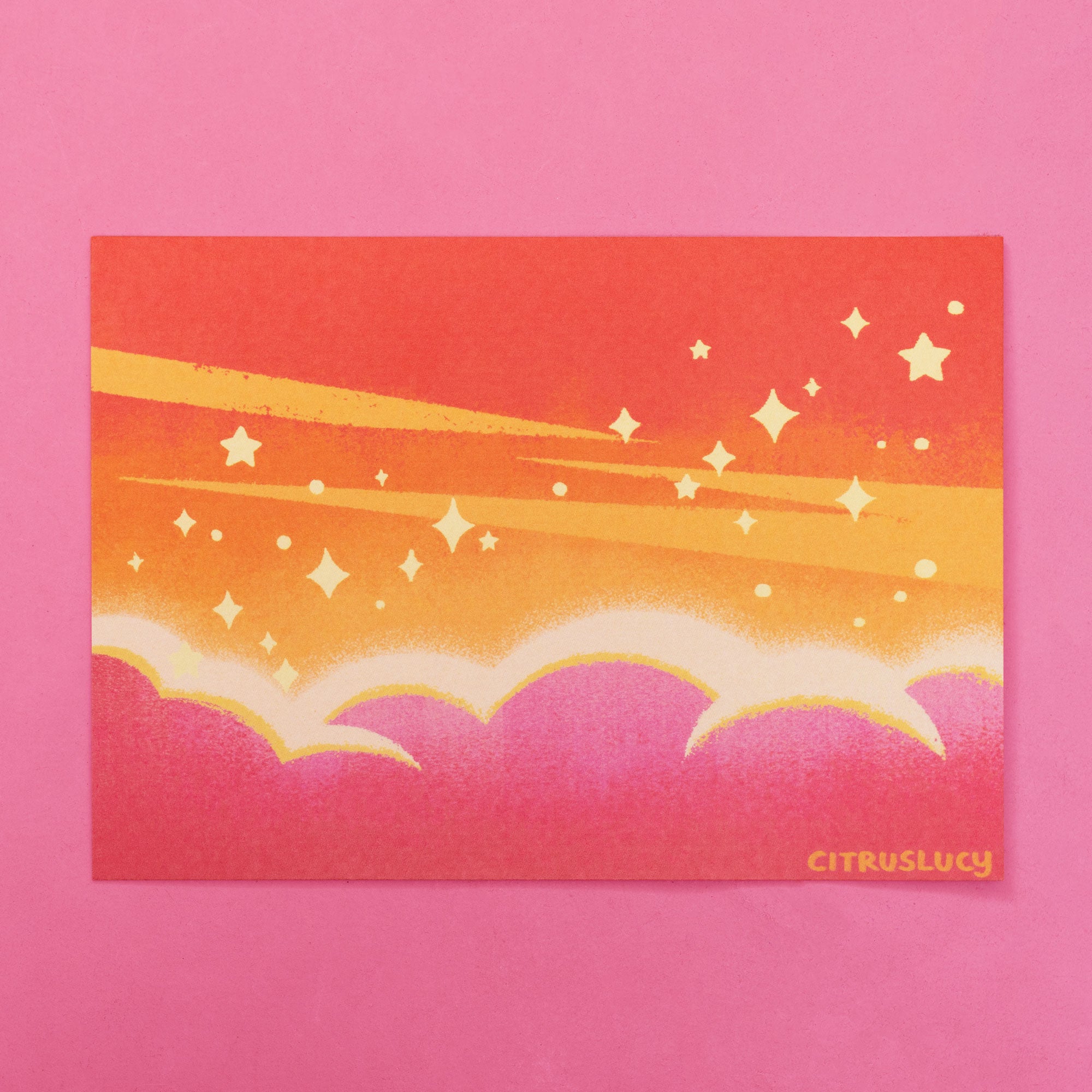 This postcard evokes the lesbian flag through a sparkly sky landscape.