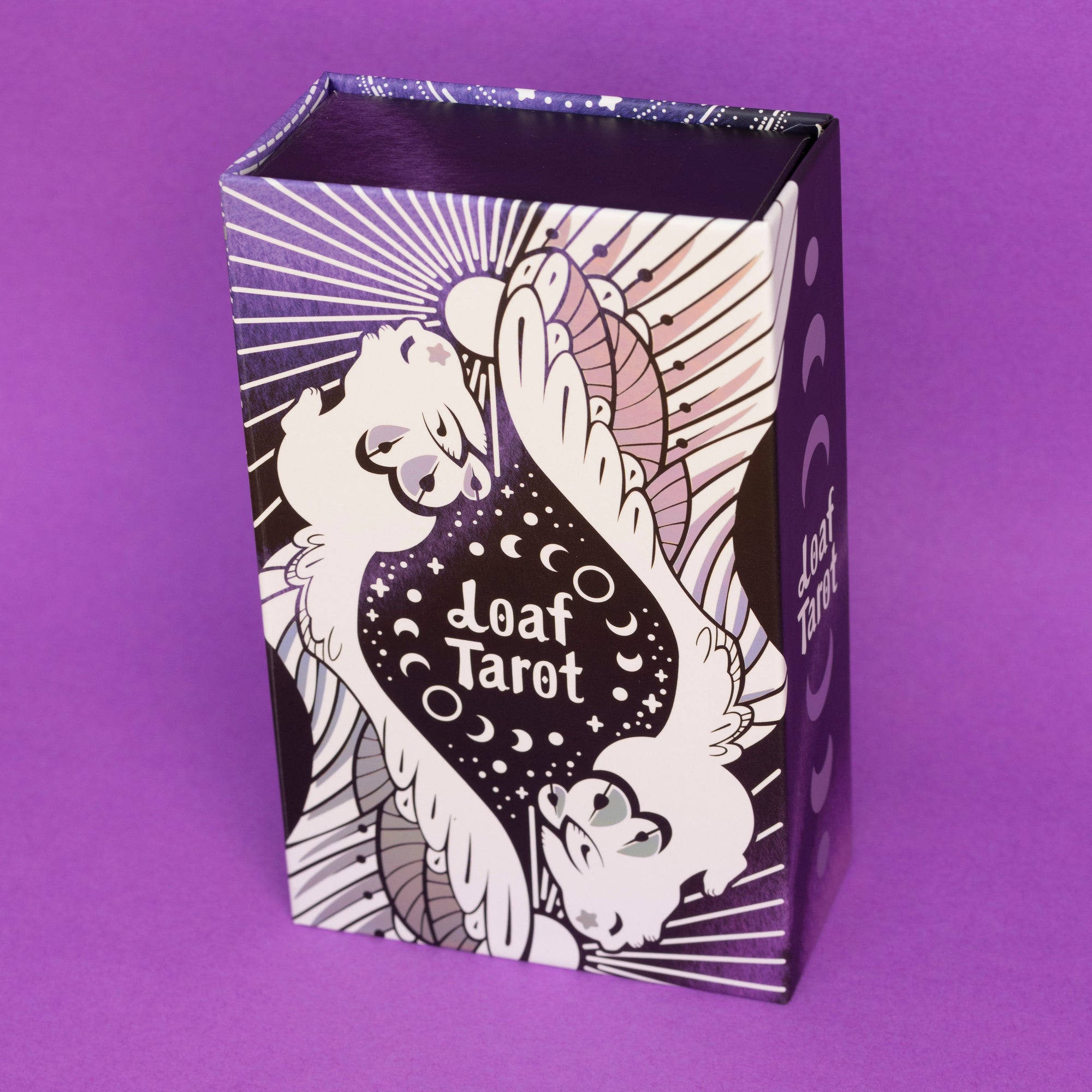 Loaf Tarot deck is a standard 78 card tarot deck featuring cute and colourful animal art from 76 different artists. The cards are printed on thick cardstock paper and UV coated for protection. Each card has holographic foil on the card edge as well as on the back of each card. The card set comes in a lovely foiled magnetic deck box!