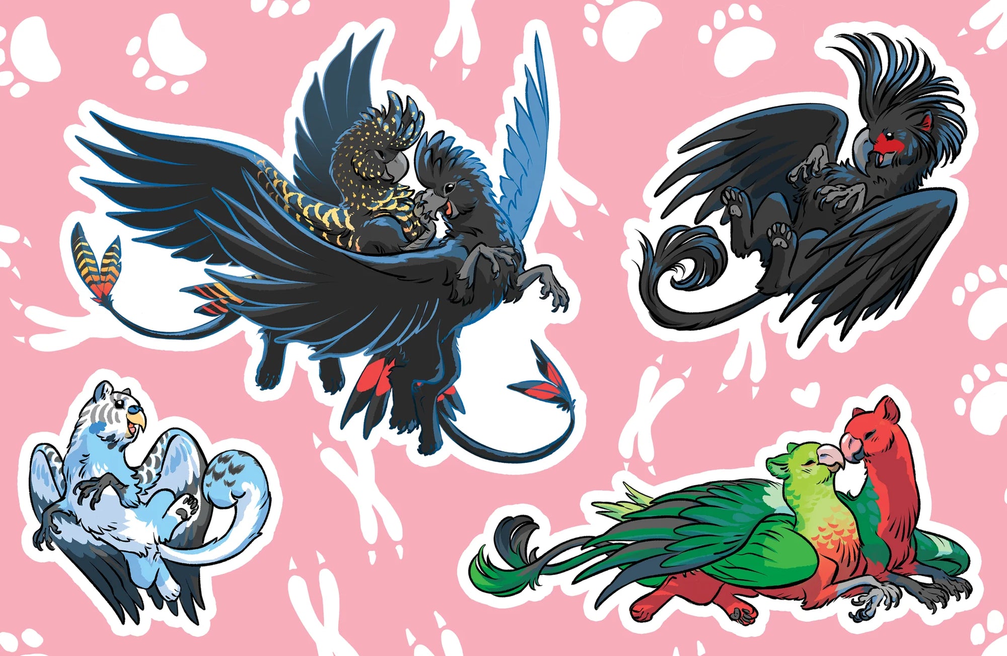 Australia parrots are the best parrots and sometimes they are also the best griffins!! These fabulous agents of chaos are now available as vinyl stickers. :) There are two sheets of designs available so choose the one you like best or get both together for a small discount! The individual griffins are kiss cut so that you can easily peel off each sticker from the sheet. The full sticker sheet measures approx 4x6". This sturdy weatherproof glossy vinyl will hold up to years of outdoor use and heavy handling! Great for phones, handheld consoles, vehicles, etc.