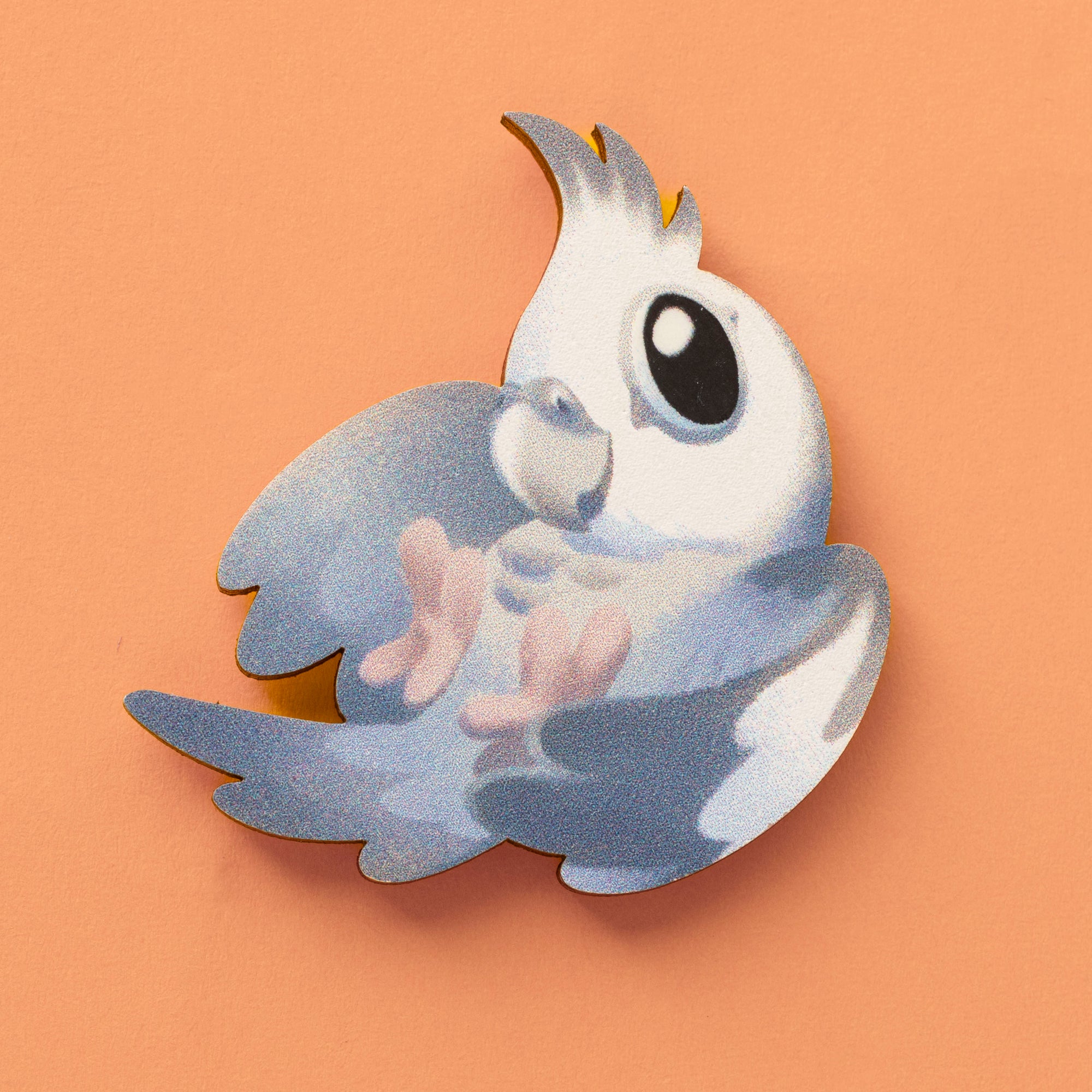 These little Aussie cockatoo pins are printed in full colour on sustainably sourced wood! They have two pin posts on the back to keep them securely in place wherever you put them (unlike the real thing) and feature a little gloss finish on their eyes for that extra spark of life when they catch the light.