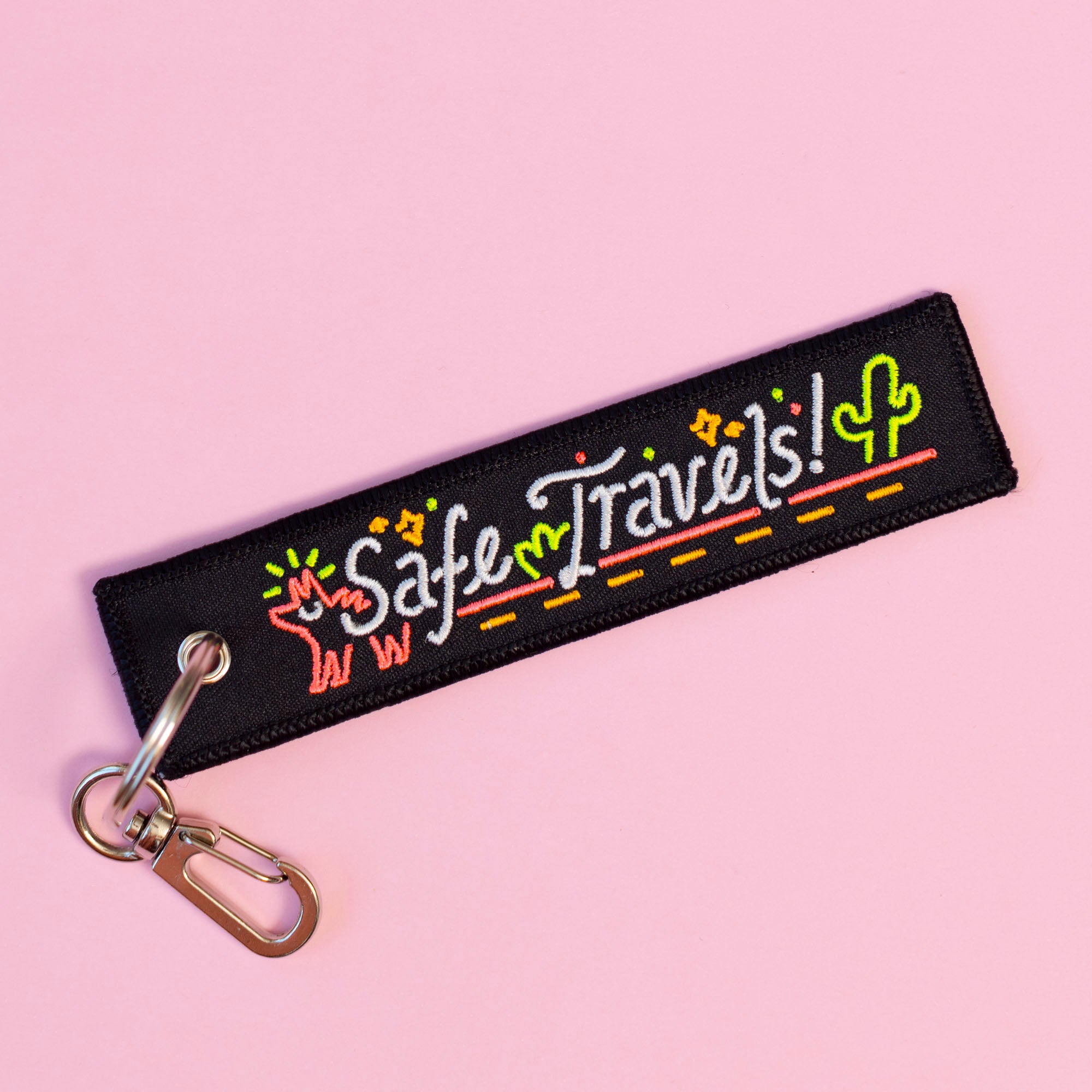Stay safe out there! This twill embroidered keychain is double-sided, with neon embroidery thread. It features a sturdy clasp and key ring that lets you clip it onto your bags, keys, or any item to add an extra flair!